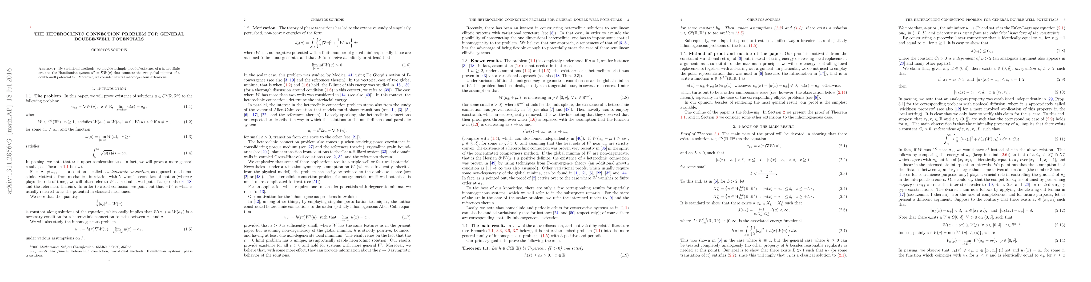 By variational methods, we provide a simple proof of existence of a heteroclinic orbit to the Hamiltonian system $u''=\nabla W(u)$ that connects the two global minima of a double-well potential $W$. Moreover, we consider several inhomogeneous extensions.