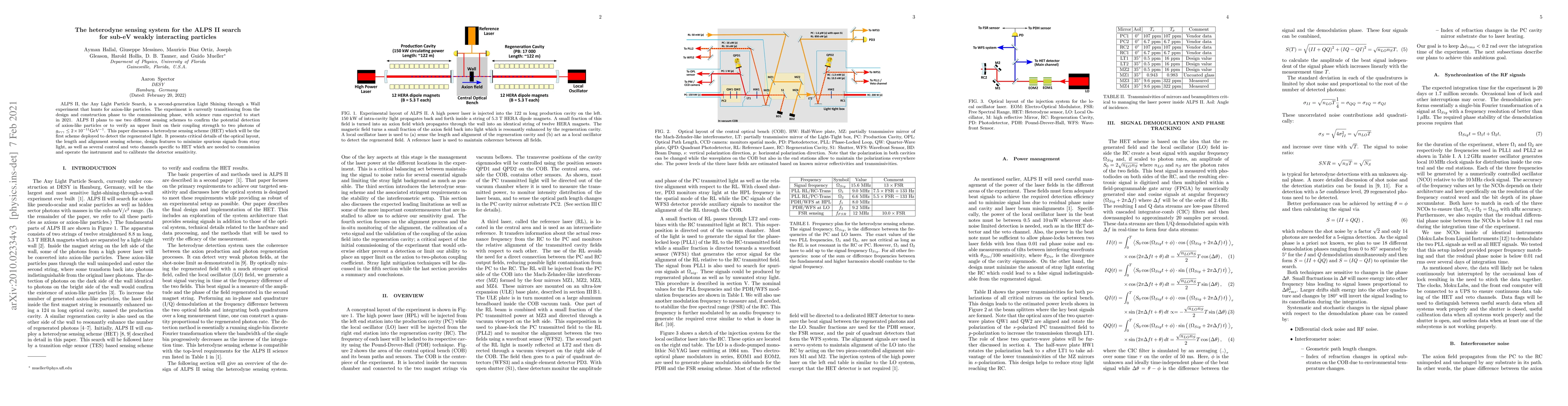 ALPS II, the Any Light Particle Search, is a second-generation Light Shining through a Wall experiment that hunts for axion-like particles. The experiment is currently transitioning from the design and construction phase to the commissioning phase, with science runs expected to start in 2021. ALPS II plans to use two different sensing schemes to confirm the potential detection of axion-like particles or to verify an upper limit on their coupling strength to two photons of $g_{a\gamma\gamma}\leq2\times10^{-11}\text{GeV}^{-1}$. This paper discusses a heterodyne sensing scheme (HET) which will be the first scheme deployed to detect the regenerated light. It presents critical details of the optical layout, the length and alignment sensing scheme, design features to minimize spurious signals from stray light, as well as several control and veto channels specific to HET which are needed to commission and operate the instrument and to calibrate the detector sensitivity.