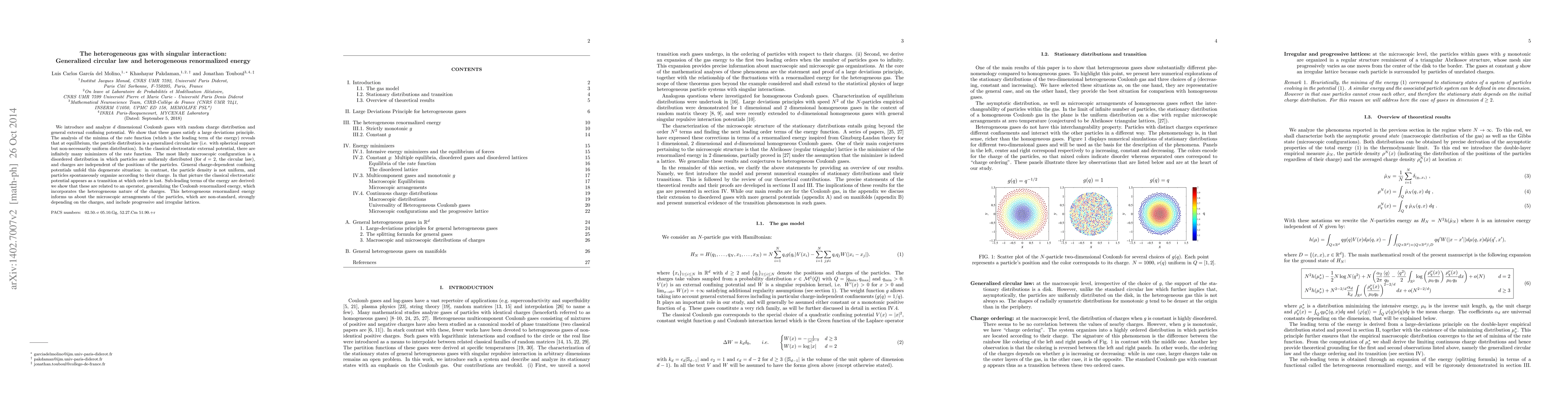 We introduce and analyze $d$ dimensional Coulomb gases with random charge distribution and general external confining potential. We show that these gases satisfy a large deviations principle. The analysis of the minima of the rate function (which is the leading term of the energy) reveals that at equilibrium, the particle distribution is a generalized circular law (i.e. with spherical support but non-necessarily uniform distribution). In the classical electrostatic external potential, there are infinitely many minimizers of the rate function. The most likely macroscopic configuration is a disordered distribution in which particles are uniformly distributed (for $d=2$, the circular law), and charges are independent of the positions of the particles. General charge-dependent confining potentials unfold this degenerate situation: in contrast, the particle density is not uniform, and particles spontaneously organize according to their charge. In that picture the classical electrostatic potential appears as a transition at which order is lost. Sub-leading terms of the energy are derived: we show that these are related to an operator, generalizing the Coulomb renormalized energy, which incorporates the heterogeneous nature of the charges. This heterogeneous renormalized energy informs us about the microscopic arrangements of the particles, which are non-standard, strongly depending on the charges, and include progressive and irregular lattices.