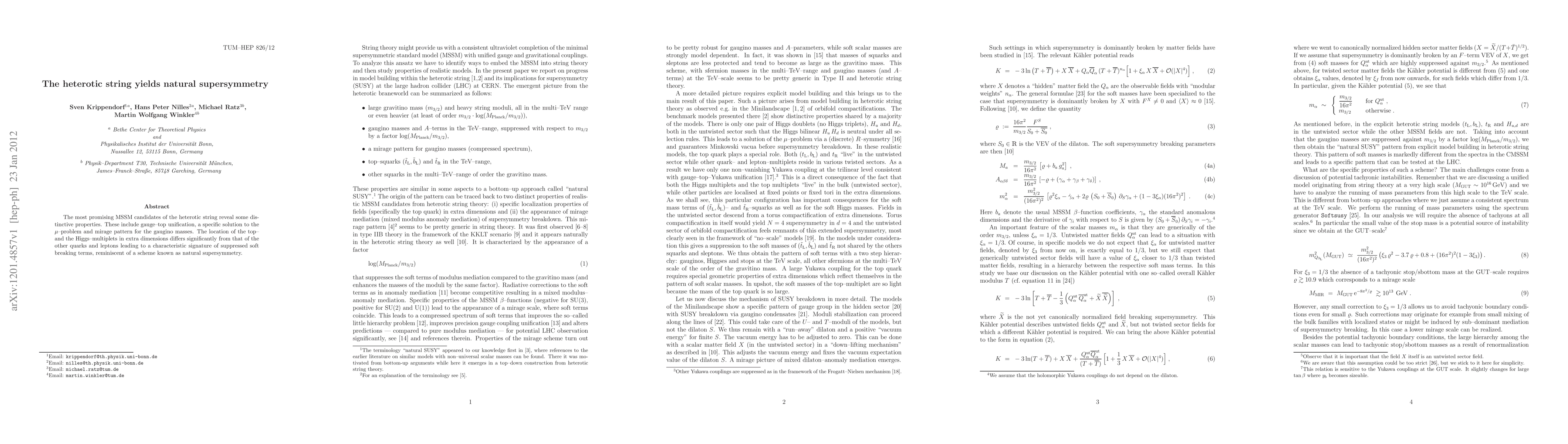 The most promising MSSM candidates of the heterotic string reveal some distinctive properties. These include gauge-top unification, a specific solution to the mu-problem and mirage pattern for the gaugino masses. The location of the top- and the Higgs-multiplets in extra dimensions differs significantly from that of the other quarks and leptons leading to a characteristic signature of suppressed soft breaking terms, reminiscent of a scheme known as natural supersymmetry.