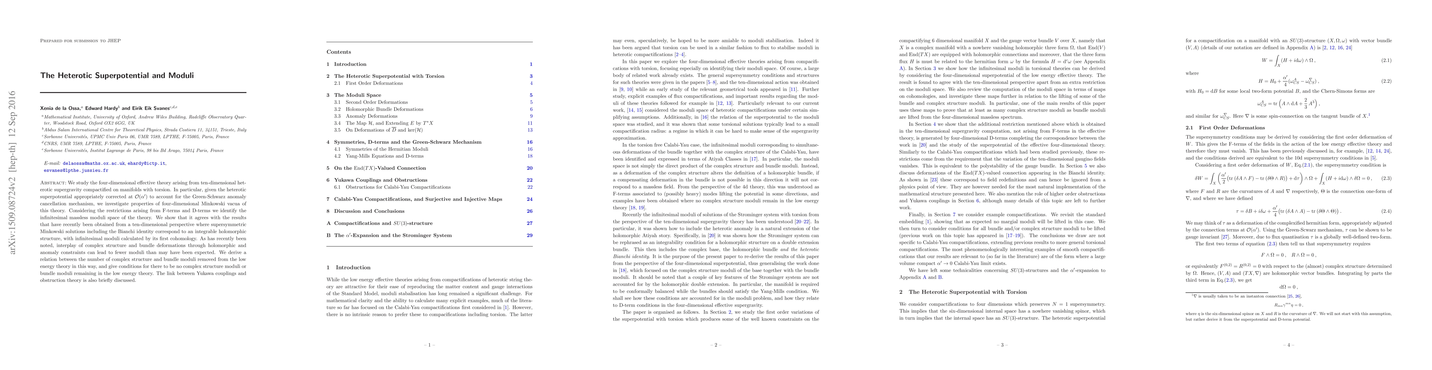 We study the four-dimensional effective theory arising from ten-dimensional heterotic supergravity compactified on manifolds with torsion. In particular, given the heterotic superpotential appropriately corrected at $\mathcal{O}(\alpha')$ to account for the Green-Schwarz anomaly cancellation mechanism, we investigate properties of four-dimensional Minkowski vacua of this theory. Considering the restrictions arising from F-terms and D-terms we identify the infinitesimal massless moduli space of the theory. We show that it agrees with the results that have recently been obtained from a ten-dimensional perspective where supersymmetric Minkowski solutions including the Bianchi identity correspond to an integrable holomorphic structure, with infinitesimal moduli calculated by its first cohomology. As has recently been noted, interplay of complex structure and bundle deformations through holomorphic and anomaly constraints can lead to fewer moduli than may have been expected. We derive a relation between the number of complex structure and bundle moduli removed from the low energy theory in this way, and give conditions for there to be no complex structure moduli or bundle moduli remaining in the low energy theory. The link between Yukawa couplings and obstruction theory is also briefly discussed.