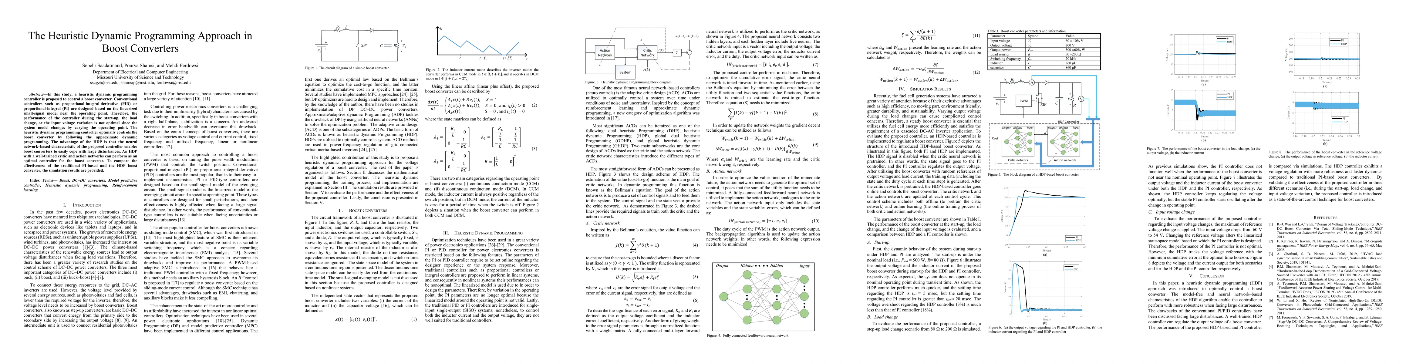 This paper proposes a heuristic dynamic programming (HDP) controller for boost converters, offering optimal control through neural networks that adapt to large disturbances. Simulation results compare the HDP approach with traditional PI-based controllers, demonstrating superior performance during start-up, load changes, and input voltage variations.