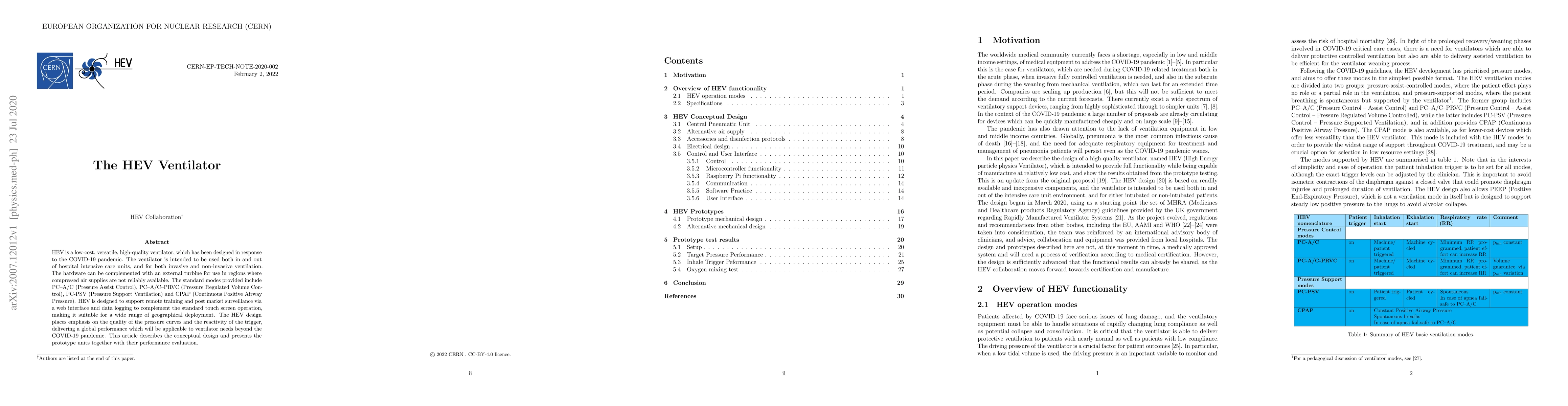 The HEV Ventilator is a low-cost, versatile ventilator designed for both hospital and remote use during the COVID-19 pandemic, featuring modes like PC-A/C, PC-A/C-PRVC, and CPAP, and supporting remote training and surveillance via a web interface. The prototype's performance evaluation highlights its global applicability beyond the pandemic.
