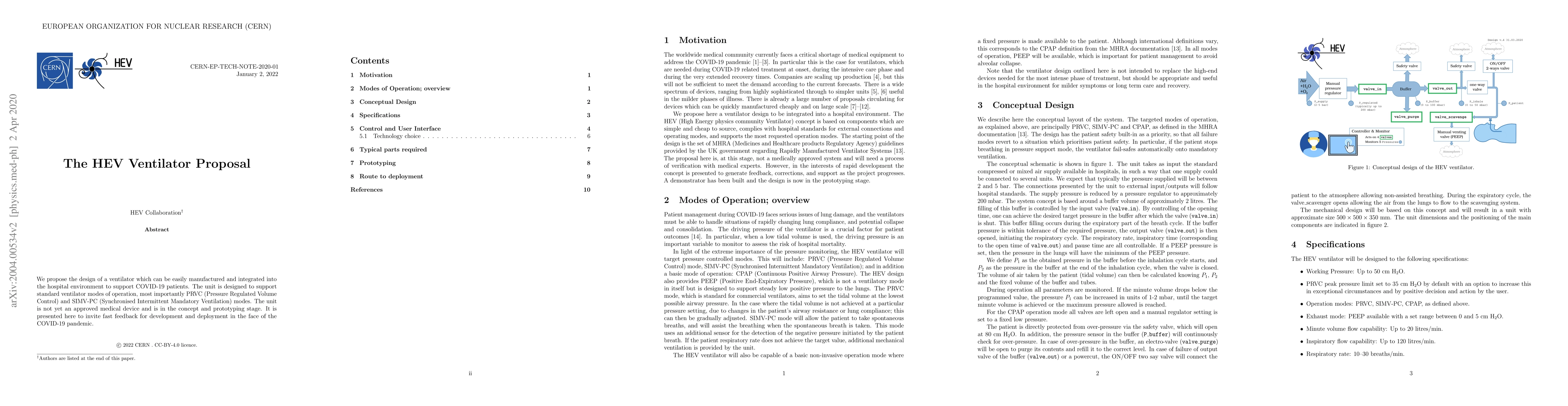 The HEV Ventilator Proposal introduces a concept for a readily manufacturable, hospital-integrated ventilator supporting PRVC and SIMV-PC modes, aimed at aiding COVID-19 patients, though it remains in the prototyping stage and requires feedback for development.