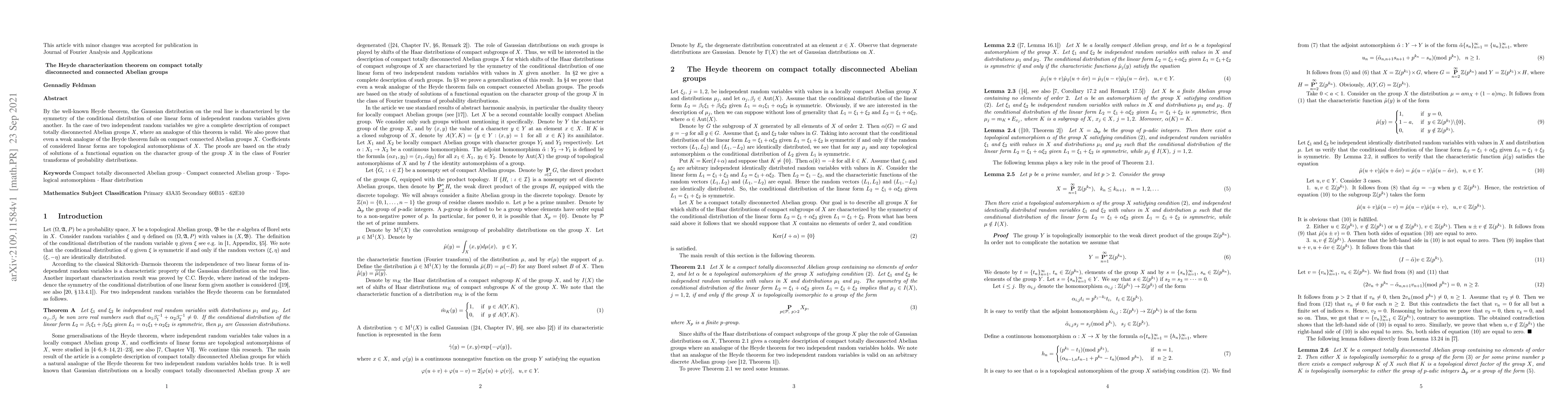 By the well-known Heyde theorem, the Gaussian distribution on the real line is characterized by the symmetry of the conditional distribution of one linear form of independent random variables given another. In the case of two independent random variables we give a complete description of compact totally disconnected Abelian groups X, where an analogue of this theorem is valid. We also prove that even a weak analogue of the Heyde theorem fails on compact connected Abelian groups X. Coefficients of considered linear forms are topological automorphisms of X. The proofs are based on the study of solutions of a functional equation on the character group of the group X in the class of Fourier transforms of probability distributions.