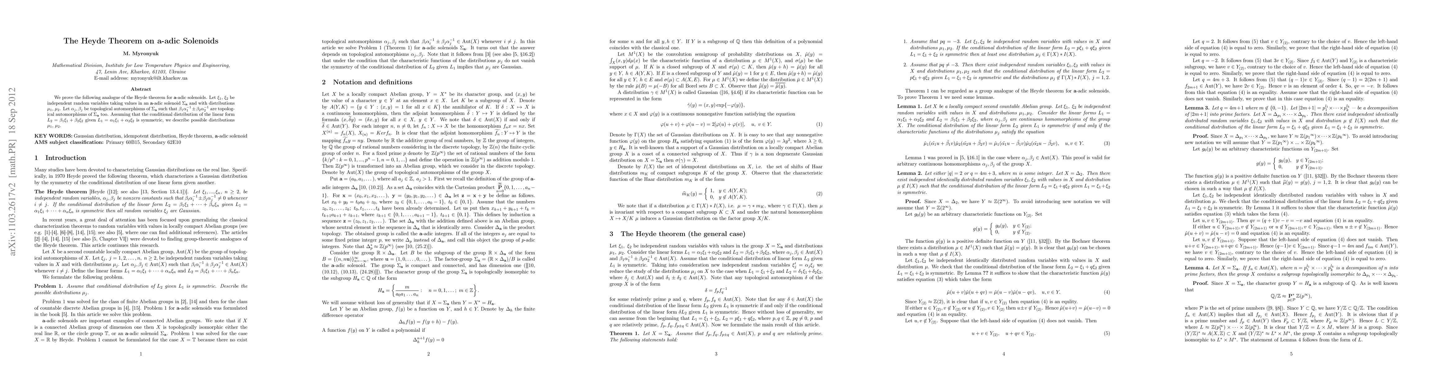 Summary: This paper establishes the Heyde theorem's analogue within the context of a-adic solenoids, extending its applicability to this specific mathematical structure. The proof provides new insights into the behavior of these topological objects.