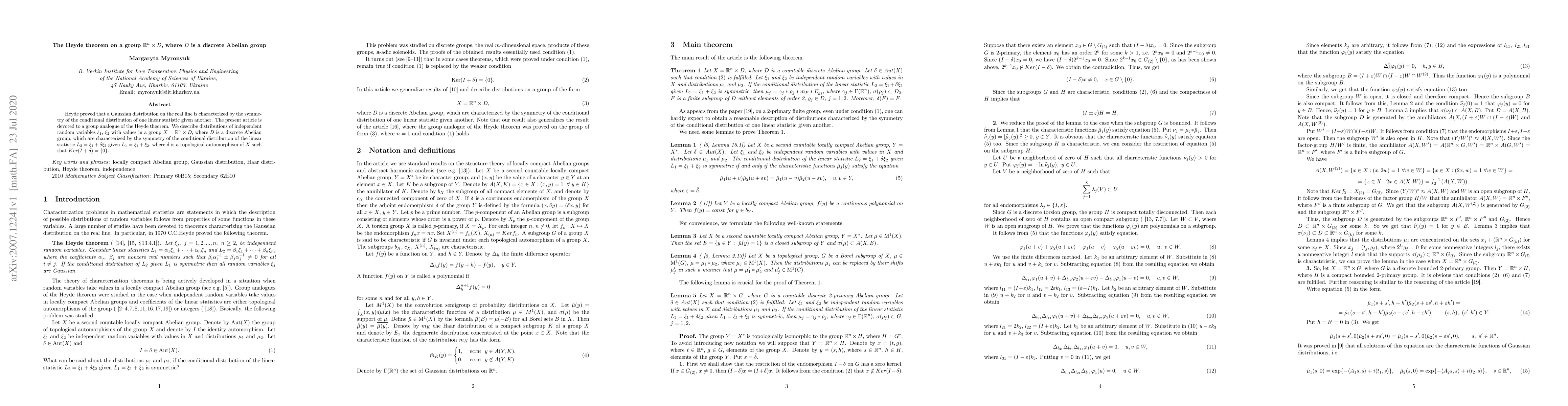 The paper extends the Heyde theorem to a group $\mathbb{R}^n \times D$, where $D$ is a discrete Abelian group, by characterizing distributions of independent random variables with values in this group.
