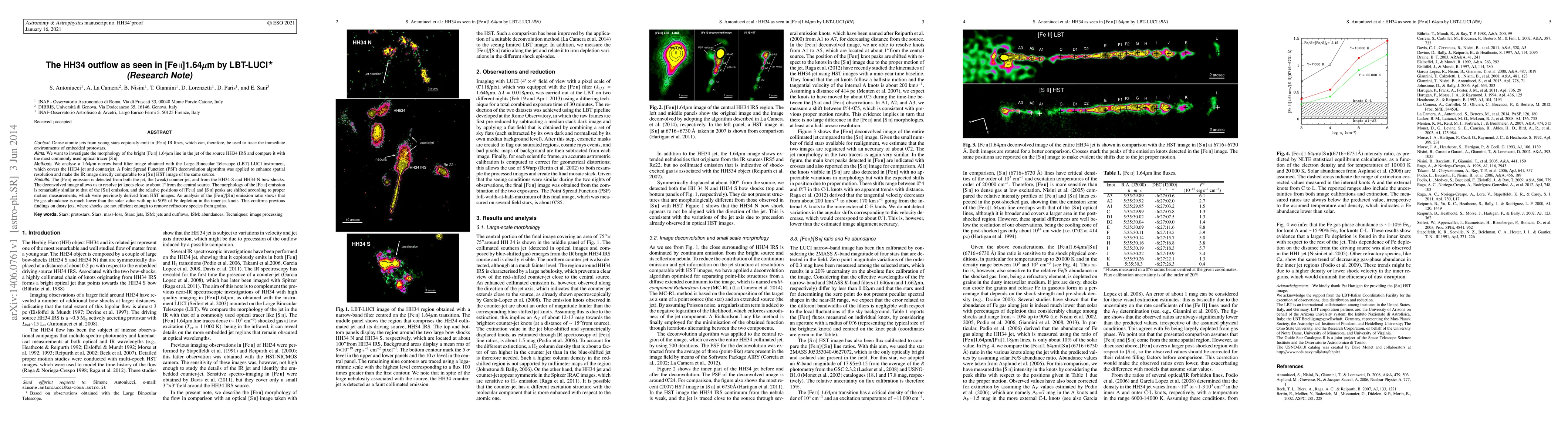 Dense atomic jets from young stars copiously emit in [FeII] IR lines, which can, therefore, be used to trace the immediate environments of embedded protostars. We want to investigate the morphology of the bright [FeII] 1.64um line in the jet of the source HH34 IRS and compare it with the most commonly used optical tracer [SII]. We analyse a 1.64um narrow-band filter image obtained with the Large Binocular Telescope (LBT) LUCI instrument, which covers the HH34 jet and counterjet. A Point Spread Function (PSF) deconvolution algorithm was applied to enhance spatial resolution and make the IR image directly comparable to a [SII] HST image of the same source. The [FeII] emission is detected from both the jet, the (weak) counter-jet, and from the HH34-S and HH34-N bow shocks. The deconvolved image allows us to resolve jet knots close to about 1\arcsec from the central source. The morphology of the [FeII] emission is remarkably similar to that of the [SII] emission, and the relative positions of [FeII] and [SII] peaks are shifted according to proper motion measurements, which were previously derived from HST images. An analysis of the [FeII]/[SII] emission ratio shows that Fe gas abundance is much lower than the solar value with up to 90% of Fe depletion in the inner jet knots. This confirms previous findings on dusty jets, where shocks are not efficient enough to remove refractory species from grains.
