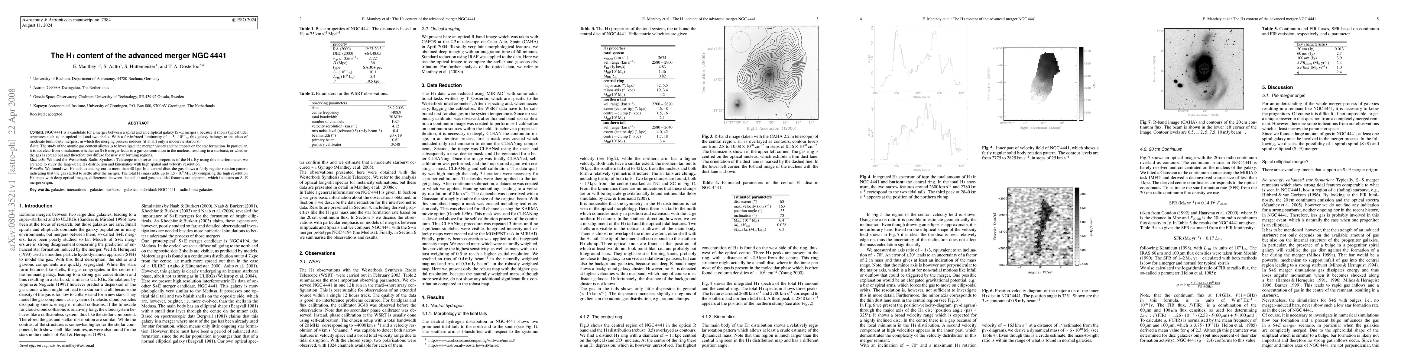 NGC 4441 is a candidate for a merger between a spiral and an elliptical galaxy (S+E merger), because it shows typical tidal structures such as an optical tail and two shells. With a far-infrared luminosity of $\sim 5\cdot 10^9 L_{\odot}$ this galaxy belongs to the class of moderate luminosity mergers, in which the merging process induces (if at all) only a moderate starburst. The study of the atomic gas content allows us to investigate the merger history and the impact on the star formation. In particular, it is not clear from simulations whether an S+E merger leads to a gas concentration in the nucleus, resulting in a starburst, or whether the gas is spread out and therefore too diffuse for new star forming regions. We used the Westerbork Radio Synthesis Telescope to observe the properties of the HI. By using this interferometer, we are able to study the large-scale HI distribution and kinematics with high spatial and velocity resolution. We found two HI tails extending out to more than 40 kpc. In a central disc, the gas shows a fairly regular rotation pattern indicating that the gas started to settle after the merger. The total HI mass adds up to $1.5 \cdot 10^9 M_{\odot}$. By comparing the high resolution HI maps with deep optical images, differences between the stellar and gaseous tidal features are apparent, which indicates an S+E merger origin.