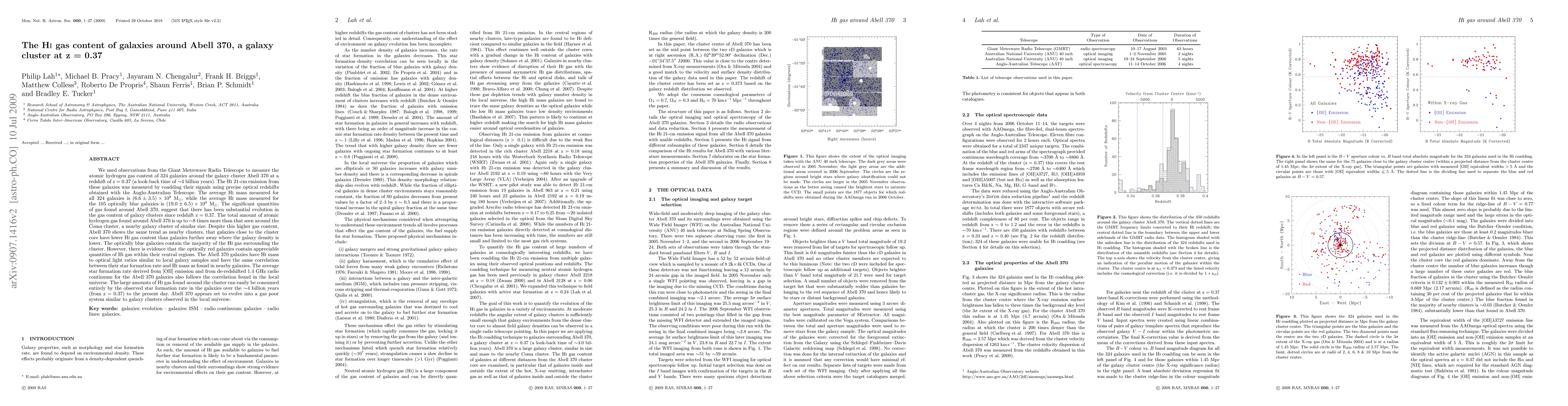 This study uses Giant Metrewave Radio Telescope observations to measure the atomic hydrogen gas content of 324 galaxies around Abell 370, revealing an average HI mass of (6.6 ± 3.5)x10^9 solar masses, with blue galaxies showing significantly higher HI mass. The findings suggest substantial evolution in gas content since z = 0.37, with Abell 370's gas content being up to 8 times more than that of the Coma cluster.