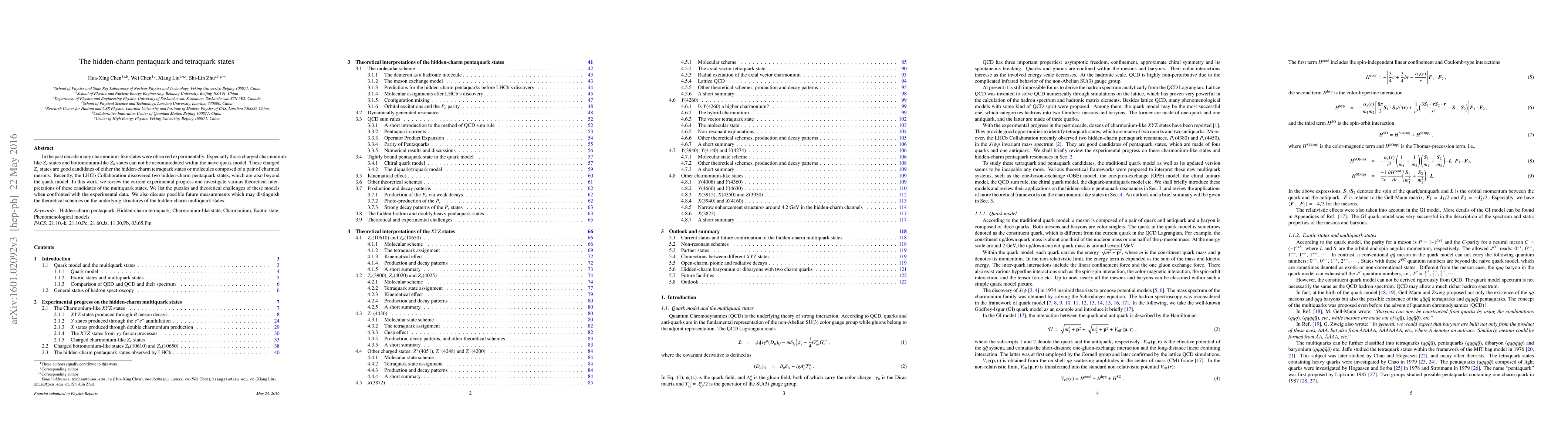 In the past decade many charmonium-like states were observed experimentally. Especially those charged charmonium-like $Z_c$ states and bottomonium-like $Z_b$ states can not be accommodated within the naive quark model. These charged $Z_c$ states are good candidates of either the hidden-charm tetraquark states or molecules composed of a pair of charmed mesons. Recently, the LHCb Collaboration discovered two hidden-charm pentaquark states, which are also beyond the quark model. In this work, we review the current experimental progress and investigate various theoretical interpretations of these candidates of the multiquark states. We list the puzzles and theoretical challenges of these models when confronted with the experimental data. We also discuss possible future measurements which may distinguish the theoretical schemes on the underlying structures of the hidden-charm multiquark states.
