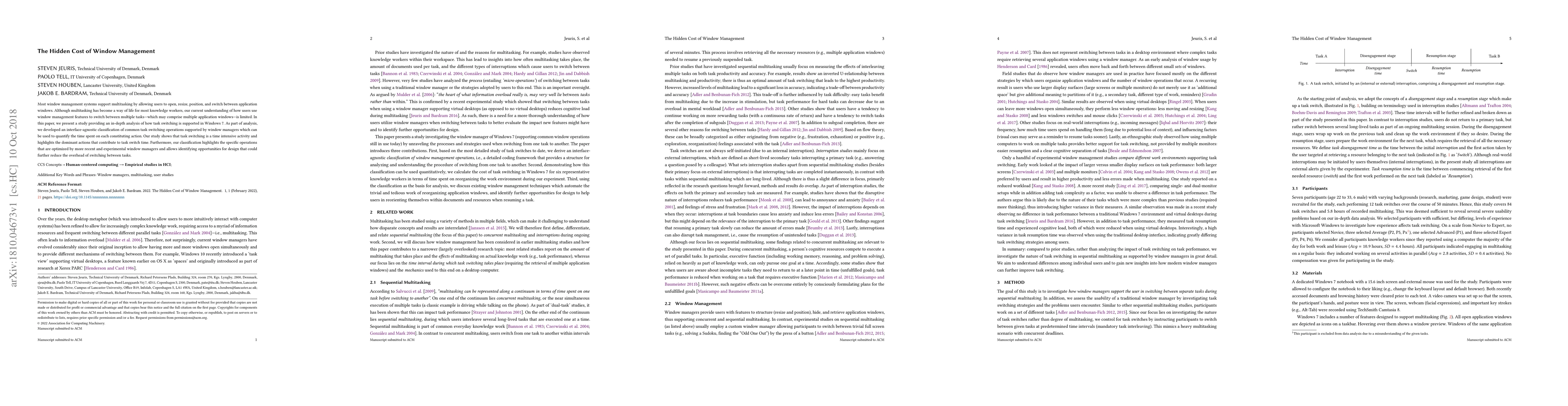 Most window management systems support multitasking by allowing users to open, resize, position, and switch between application windows. Although multitasking has become a way of life for most knowledge workers, our current understanding of how users use window management features to switch between multiple tasks---which may comprise multiple application windows---is limited. In this paper, we present a study providing an in-depth analysis of how task switching is supported in Windows 7. As part of analysis, we developed an interface-agnostic classification of common task switching operations supported by window managers which can be used to quantify the time spent on each constituting action. Our study shows that task switching is a time intensive activity and highlights the dominant actions that contribute to task switch time. Furthermore, our classification highlights the specific operations that are optimized by more recent and experimental window managers and allows identifying opportunities for design that could further reduce the overhead of switching between tasks.