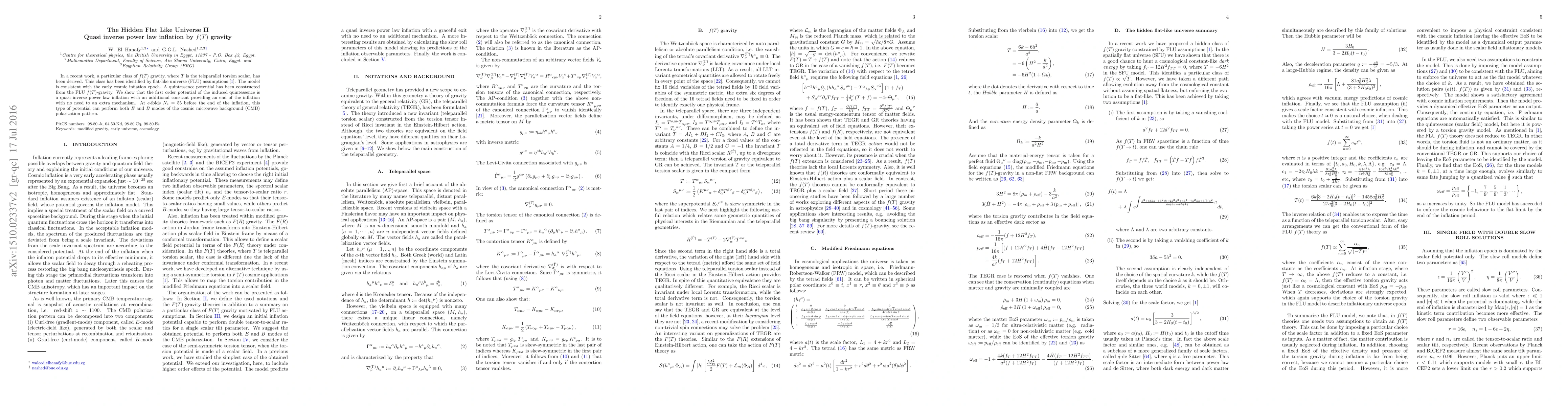 In a recent work, a particular class of $f(T)$ gravity, where $T$ is the teleparallel torsion scalar, has been derived. This class has been identified by flat-like universe (FLU) assumptions \cite{HN15}. The model is consistent with the early cosmic inflation epoch. A quintessence potential has been constructed from the FLU $f(T)$-gravity. We show that the first order potential of the induced quintessence is a quasi inverse power law inflation with an additional constant providing an end of the inflation with no need to an extra mechanism. At $e$-folds $N_{*}= 55$ before the end of the inflation, this type of potential can perform both $E$ and $B$ modes of the cosmic microwave background (CMB) polarization pattern.
