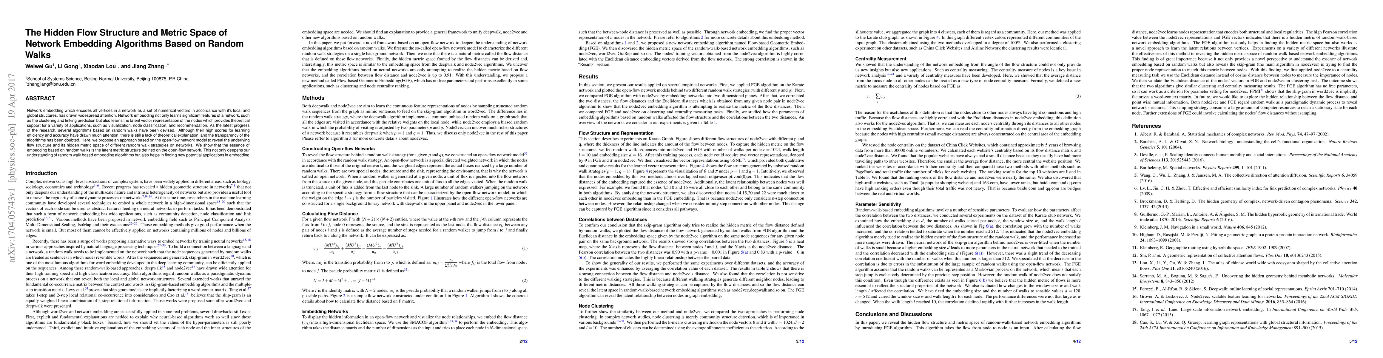 Network embedding which encodes all vertices in a network as a set of numerical vectors in accordance with it's local and global structures, has drawn widespread attention. Network embedding not only learns significant features of a network, such as the clustering and linking prediction but also learns the latent vector representation of the nodes which provides theoretical support for a variety of applications, such as visualization, node classification, and recommendation. As the latest progress of the research, several algorithms based on random walks have been devised. Although their high scores for learning efficiency and accuracy have drawn much attention, there is still a lack of theoretical explanation, and the transparency of the algorithms has been doubted. Here, we propose an approach based on the open-flow network model to reveal the underlying flow structure and its hidden metric space of different random walk strategies on networks. We show that the essence of embedding based on random walks is the latent metric structure defined on the open-flow network. This not only deepens our understanding of random walk based embedding algorithms but also helps in finding new potential applications in embedding.