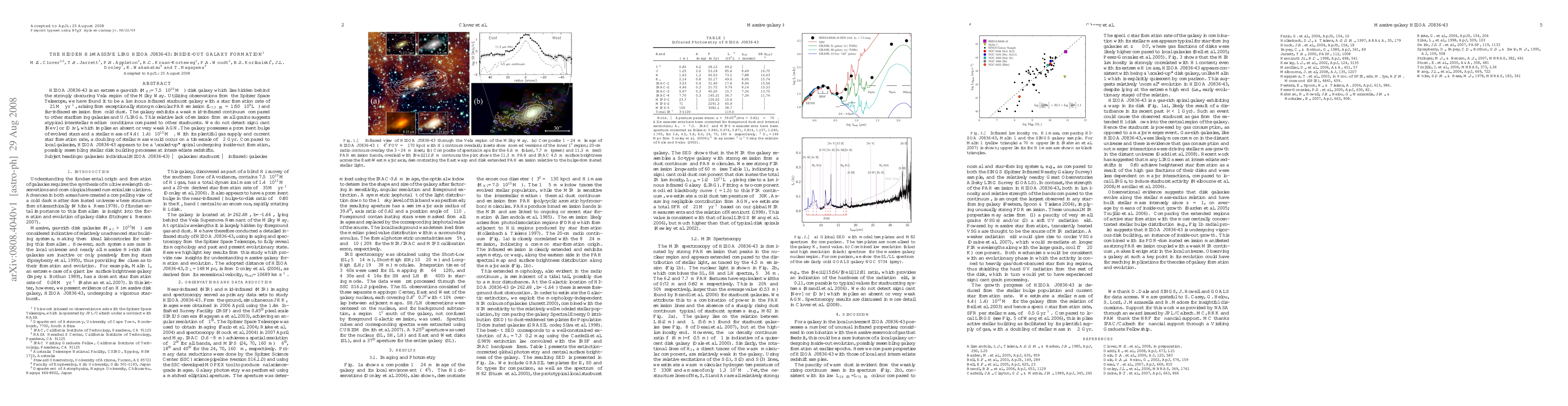 HIZOA J0836-43 is an extreme gas-rich ($M_{\rm{HI}}$=7.5$\times10^{10} M_{\sun}$) disk galaxy which lies hidden behind the strongly obscuring Vela region of the Milky Way. Utilizing observations from the {\it Spitzer Space Telescope}, we have found it to be a luminous infrared starburst galaxy with a star formation rate of $\sim 21 M_{\sun} \rm{yr^{-1}}$, arising from exceptionally strong molecular PAH emission ($L_{7.7\micron} = 1.50 \times 10^{9} L_{\odot}$) and far-infrared emission from cold dust. The galaxy exhibits a weak mid-infrared continuum compared to other starforming galaxies and U/LIRGs. This relative lack of emission from small grains suggests atypical interstellar medium conditions compared to other starbursts. We do not detect significant $[$Ne {\sc v}$]$ or $[$O {\sc iv}$]$, which implies an absent or very weak AGN. The galaxy possesses a prominent bulge of evolved stars and a stellar mass of 4.4($\pm$1.4)$\times10^{10} M_{\sun}$. With its plentiful gas supply and current star formation rate, a doubling of stellar mass would occur on a timescale of $\sim$2 Gyr. Compared to local galaxies, HIZOA J0836-43 appears to be a "scaled-up" spiral undergoing inside-out formation, possibly resembling stellar disk building processes at intermediate redshifts.
