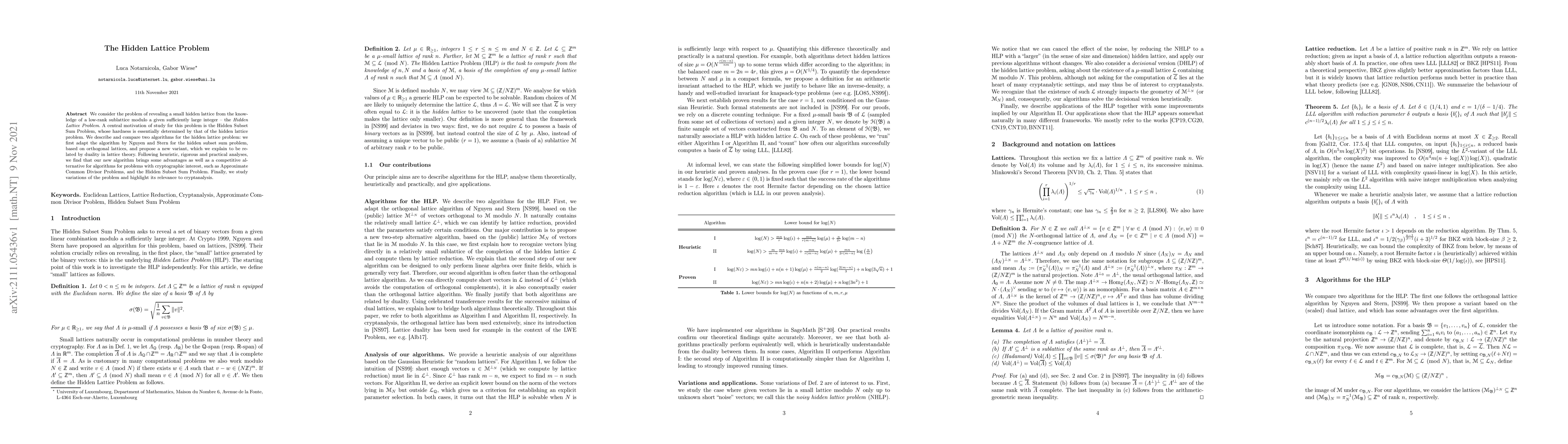 This paper introduces the Hidden Lattice Problem, which involves revealing a small hidden lattice from a low-rank sublattice modulo a large integer. Two algorithms are presented and analyzed: one adapted from Nguyen and Stern's work for the Hidden Subset Sum Problem, and a new variant. The new algorithm is found to offer advantages and be a competitive alternative for problems like Approximate Common Divisor Problems and the Hidden Subset Sum Problem. The paper also explores variations of the problem and its relevance to cryptanalysis.