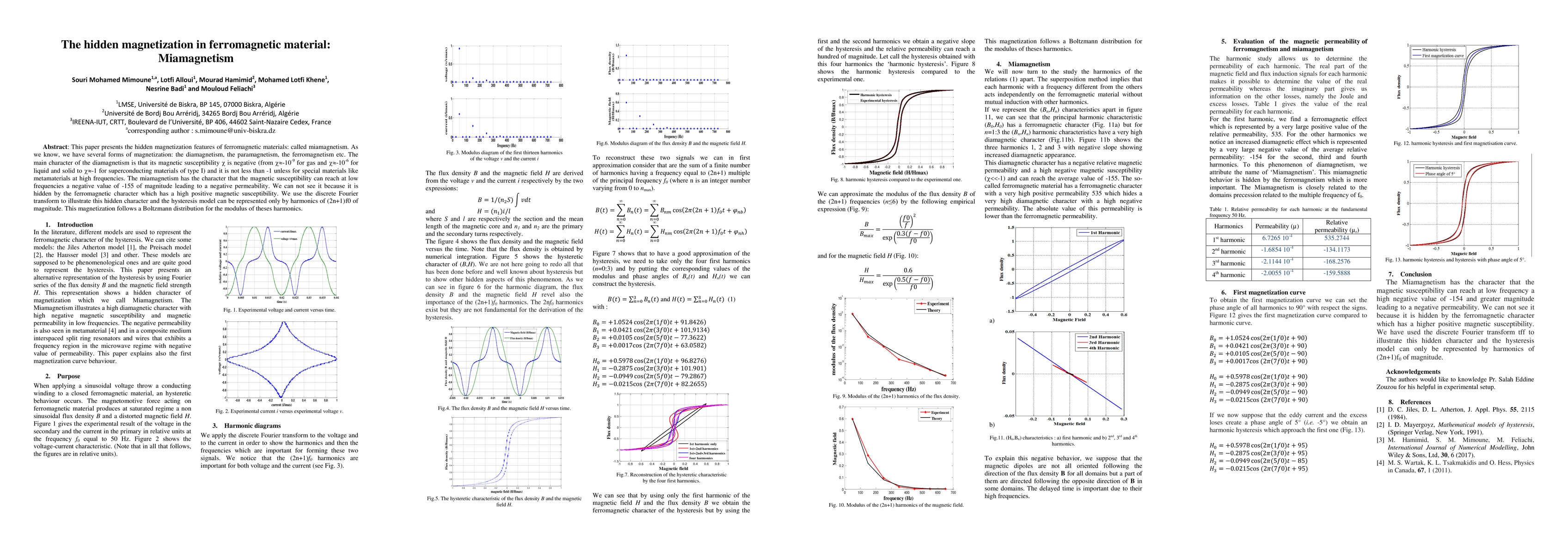 This paper presents the hidden magnetization features of ferromagnetic materials: called miamagnetism. As we know, we have several forms of magnetization: the diamagnetism, the paramagnetism, the ferromagnetism etc. The main character of the diamagnetism is that its magnetic susceptibility is negative (from -1e-9 for gas and -1e-6 for liquid and solid to -1 for superconducting materials of type I) and it is not less than -1 unless for special materials like metamaterials at high frequencies. The miamagnetism has the character that the magnetic susceptibility can reach at low frequencies a negative value of -155 of magnitude leading to a negative permeability. We can not see it because it is hidden by the ferromagnetic character which has a high positive magnetic susceptibility. We use the discrete Fourier transform to illustrate this hidden character and the hysteresis model can be represented only by harmonics of (2n+1)f0 of magnitude. This magnetization follows a Boltzmann distribution for the modulus of theses harmonics.