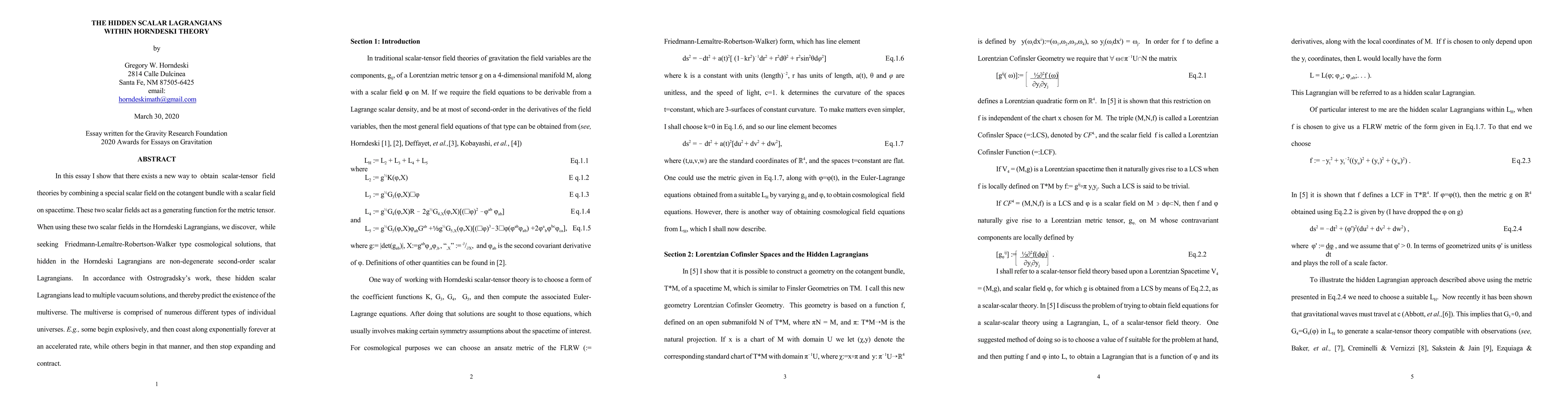 In this essay I show that there exists a new way to obtain scalar-tensor field theories by combining a special scalar field on the tangent bundle of a four-dimensional manifold with a scalar field on that manifold. These two scalar fields act as a generating function for the metric tensor. When using these two scalar fields in the Horndeski Lagrangians, we discover, while seeking Friedmann-Lemaitre-Robertson-Walker type cosmological solutions, that hidden in the Horndeski Lagrangians are non-degenerate second-order scalar Lagrangians. In accordance with Ostrogradsky's work, these hidden scalar Lagrangians lead to multiple vacuum solutions, and thereby predict the existence of a multiverse. The multiverse is comprised of numerous different types of individual universes. E.g., some begin explosively, and then coast along exponentially forever at an accelerated rate, while some begin in that manner, and then stop expanding and contract to their original initial stage.