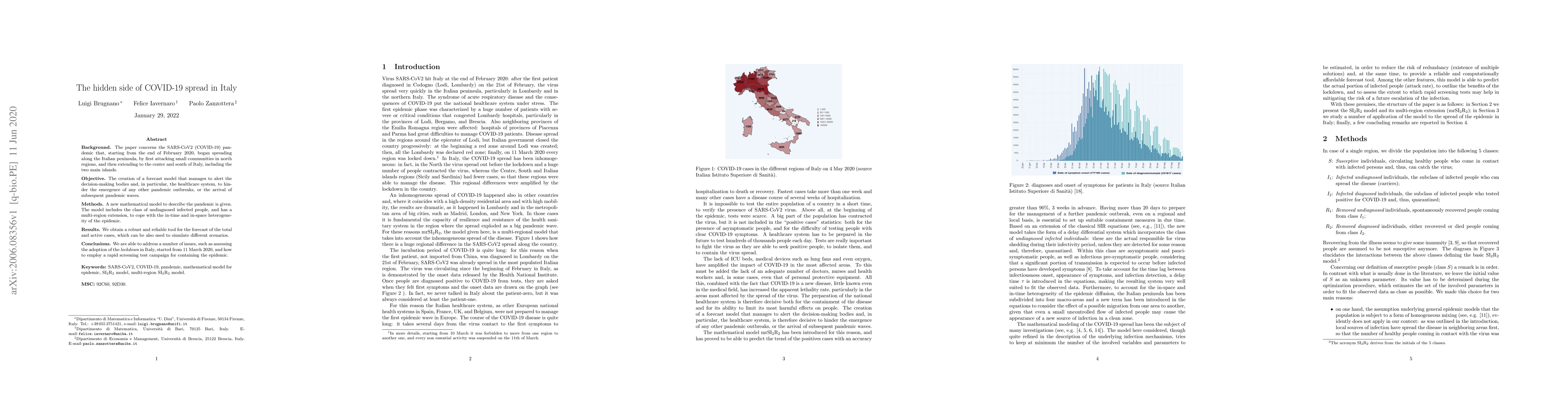 Background. The paper concerns the SARS-CoV2 (COVID-19) pandemic that, starting from the end of February 2020, began spreading along the Italian peninsula, by first attacking small communities in north regions, and then extending to the center and south of Italy, including the two main islands. Objective. The creation of a forecast model that manages to alert the decision-making bodies and, in particular, the healthcare system, to hinder the emergence of any other pandemic outbreaks, or the arrival of subsequent pandemic waves. Methods. A new mathematical model to describe the pandemic is given. The model includes the class of undiagnosed infected people, and has a multi-region extension, to cope with the in-time and in-space heterogeneity of the epidemic. Results. We obtain a robust and reliable tool for the forecast of the total and active cases, which can be also used to simulate different scenarios. Conclusions. We are able to address a number of issues, such as assessing the adoption of the lockdown in Italy, started from 11 March 2020, and how to employ a rapid screening test campaign for containing the epidemic.