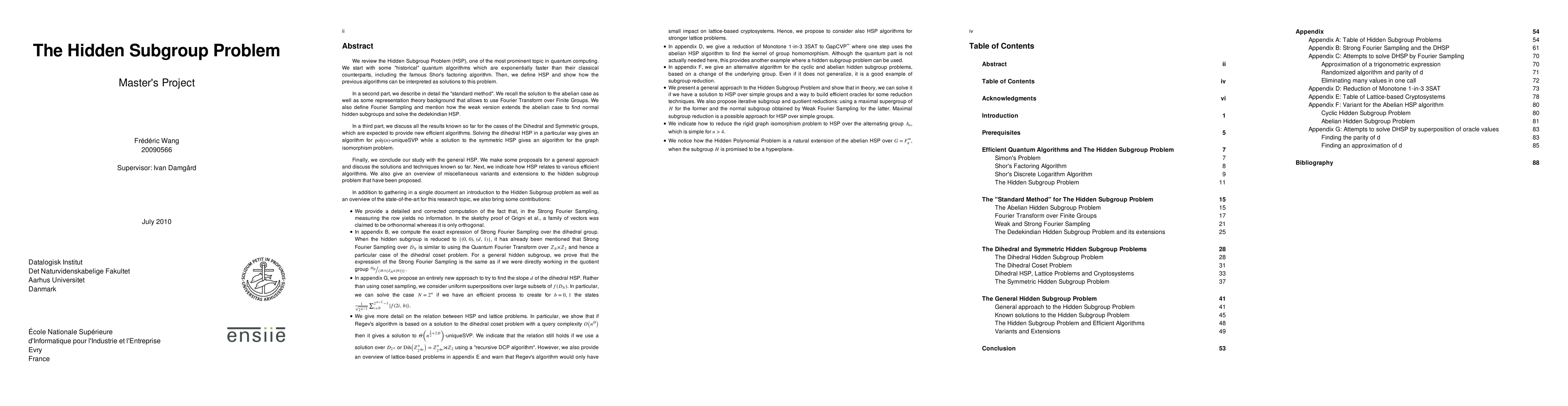 We give an overview of the Hidden Subgroup Problem (HSP) as of July 2010, including new results discovered since the survey of arXiv:quant-ph/0411037v1. We recall how the problem provides a framework for efficient quantum algorithms and present the standard methods based on coset sampling. We study the Dihedral and Symmetric HSPs and how they relate to hard problems on lattices and graphs. Finally, we conclude with the known solutions and techniques, describe connections with efficient algorithms as well as miscellaneous variants of HSP. We also bring various contributions to the topic. We show that in theory, we can solve HSP over a given group inductively: the base case is solving HSP over its simple factor groups and the inductive step is building efficient oracles over a normal subgroup N and over the factor group G/N. We apply this analysis to the Dedekindian HSP to get an alternative abelian HSP algorithm based on a change of the underlying group. We also propose a quotient reduction by the normal group obtained via Weak Fourier Sampling. We compute the exact expression of Strong Fourier Sampling over the dihedral group, showing how the previous reduction is natural and matches the standard one. We also give a reduction of rigid graph isomorphism problem to HSP over the alternating group. For this group and other simple groups, we propose maximal subgroup reduction as a possible approach. We also analyse Regev's algorithm for the poly(n)-uniqueSVP, prove how the degree of the polynomial is related to the oracle complexity used and we suggest several variants.