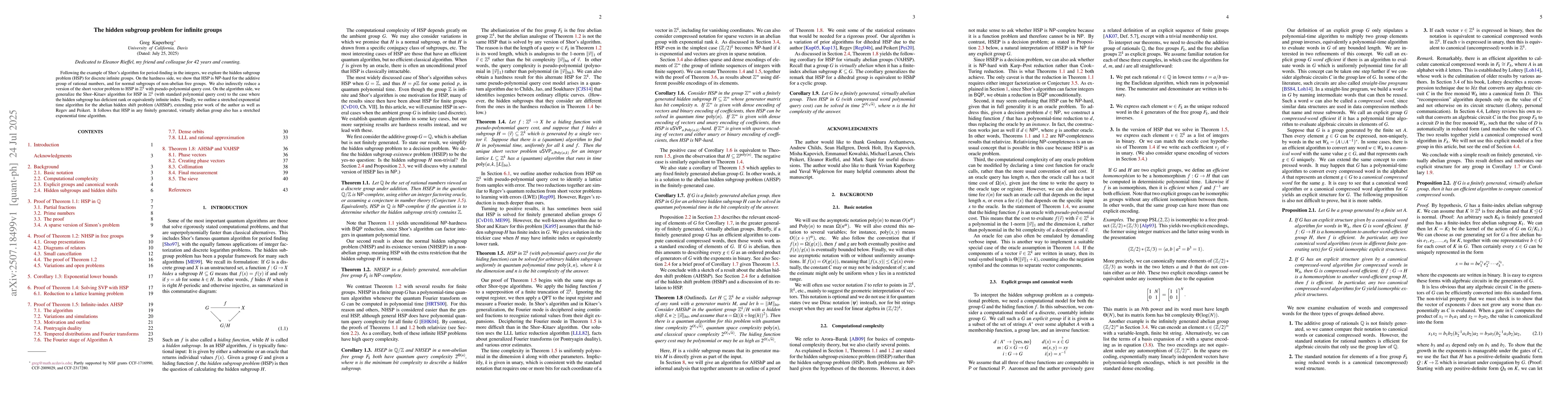 Following the example of Shor's algorithm for period-finding in the integers, we explore the hidden subgroup problem (HSP) for discrete infinite groups. On the hardness side, we show that HSP is NP-hard for the additive group of rational numbers, and for normal subgroups of non-abelian free groups. We also indirectly reduce a version of the short vector problem to HSP in $\mathbb{Z}^k$ with pseudo-polynomial query cost. On the algorithm side, we generalize the Shor-Kitaev algorithm for HSP in $\mathbb{Z}^k$ (with standard polynomial query cost) to the case where the hidden subgroup has deficient rank or equivalently infinite index. Finally, we outline a stretched exponential time algorithm for the abelian hidden shift problem (AHShP), extending prior work of the author as well as Regev and Peikert. It follows that HSP in any finitely generated, virtually abelian group also has a stretched exponential time algorithm.