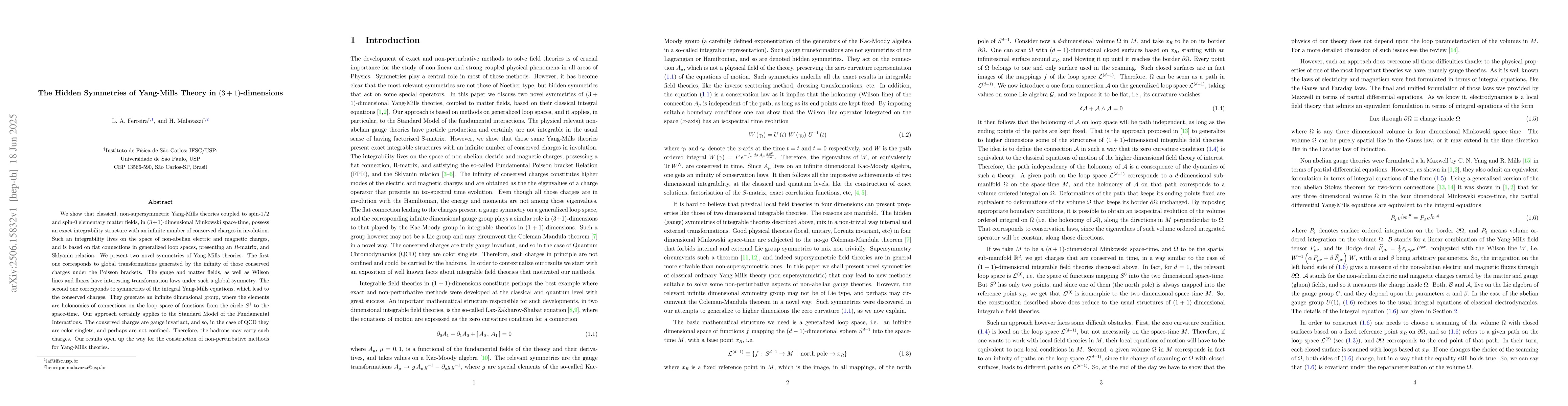 We show that classical, non-supersymmetric Yang-Mills theories coupled to spin-1/2 and spin-0 elementary matter fields, in (3+1)-dimensional Minkowski space-time, possess an exact integrability structure with an infinite number of conserved charges in involution. Such an integrability lives on the space of non-abelian electric and magnetic charges, and is based on flat connections in generalized loop spaces, presenting an R-matrix, and Sklyanin relation. We present two novel symmetries of Yang-Mills theories. The first one corresponds to global transformations generated by the infinity of those conserved charges under the Poisson brackets. The gauge and matter fields, as well as Wilson lines and fluxes have interesting transformation laws under such a global symmetry. The second one corresponds to symmetries of the integral Yang-Mills equations, which lead to the conserved charges. They generate an infinite dimensional group, where the elements are holonomies of connections on the loop space of functions from the circle $S^1$ to the space-time. Our approach certainly applies to the Standard Model of the Fundamental Interactions. The conserved charges are gauge invariant, and so, in the case of QCD they are color singlets, and perhaps are not confined. Therefore, the hadrons may carry such charges. Our results open up the way for the construction of non-perturbative methods for Yang-Mills theories.