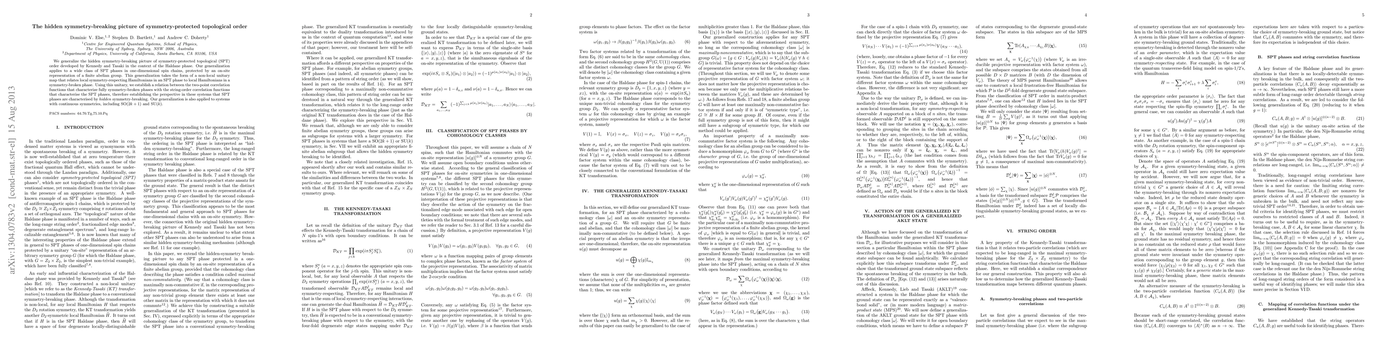 This paper generalizes the hidden symmetry-breaking picture for symmetry-protected topological (SPT) order, extending it to a broad class of one-dimensional spin chains protected by finite abelian groups. It introduces a non-local unitary map linking SPT phases with symmetry-broken phases, establishing a connection between correlation functions in both contexts.