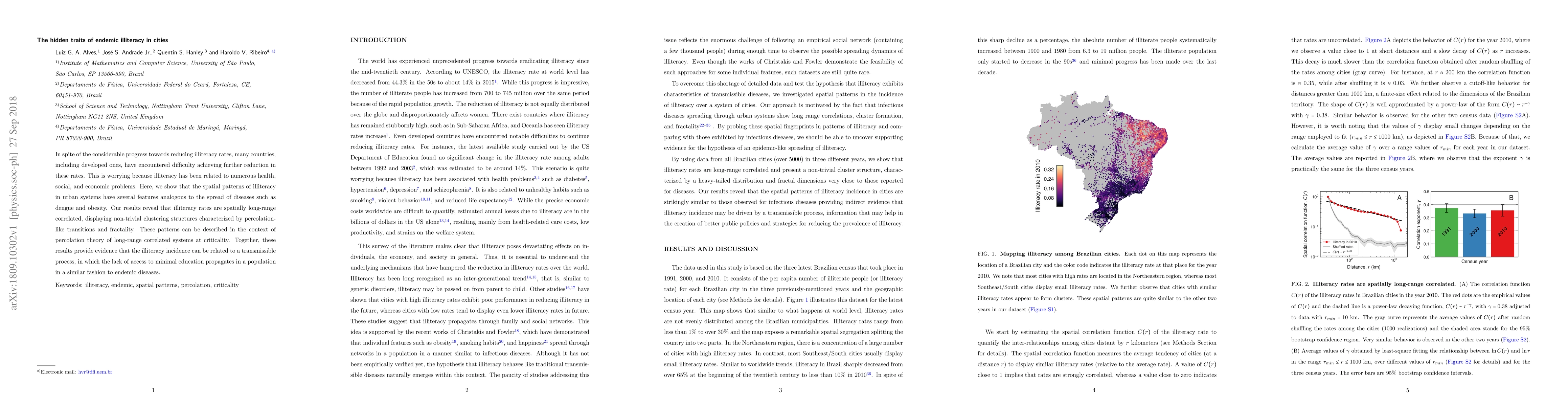 In spite of the considerable progress towards reducing illiteracy rates, many countries, including developed ones, have encountered difficulty achieving further reduction in these rates. This is worrying because illiteracy has been related to numerous health, social, and economic problems. Here, we show that the spatial patterns of illiteracy in urban systems have several features analogous to the spread of diseases such as dengue and obesity. Our results reveal that illiteracy rates are spatially long-range correlated, displaying non-trivial clustering structures characterized by percolation-like transitions and fractality. These patterns can be described in the context of percolation theory of long-range correlated systems at criticality. Together, these results provide evidence that the illiteracy incidence can be related to a transmissible process, in which the lack of access to minimal education propagates in a population in a similar fashion to endemic diseases.