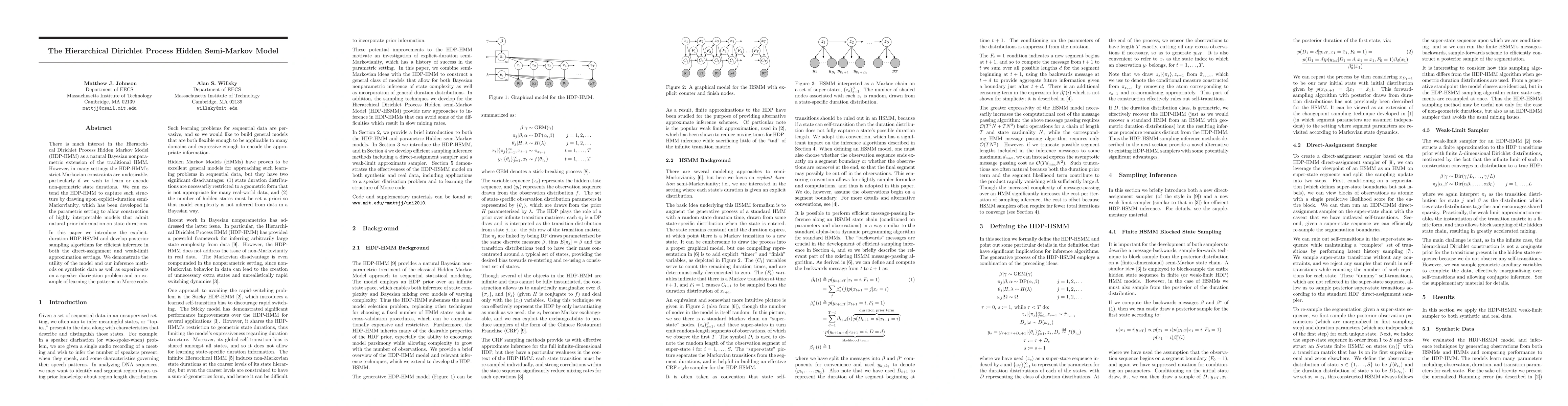 This paper introduces the Hierarchical Dirichlet Process Hidden Semi-Markov Model (HDP-HSMM) to overcome the limitations of the HDP-HMM's strict Markovian constraints, allowing for non-geometric state durations. It develops posterior sampling algorithms for efficient inference and demonstrates the model's utility through synthetic data, speaker diarization, and Morse code pattern learning.