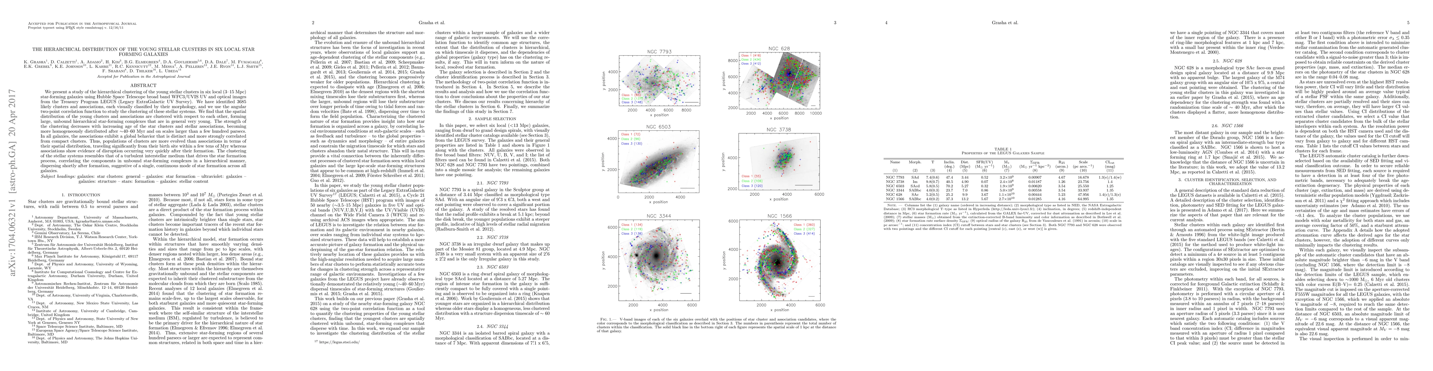 The study uses Hubble Space Telescope broad band WFC3/UVIS UV and optical images from the LEGUS (Legacy ExtraGalactic UV Survey) to identify and classify 3685 likely clusters and associations in six local star-forming galaxies. The angular two-point correlation function is applied to measure the clustering of these stellar systems.