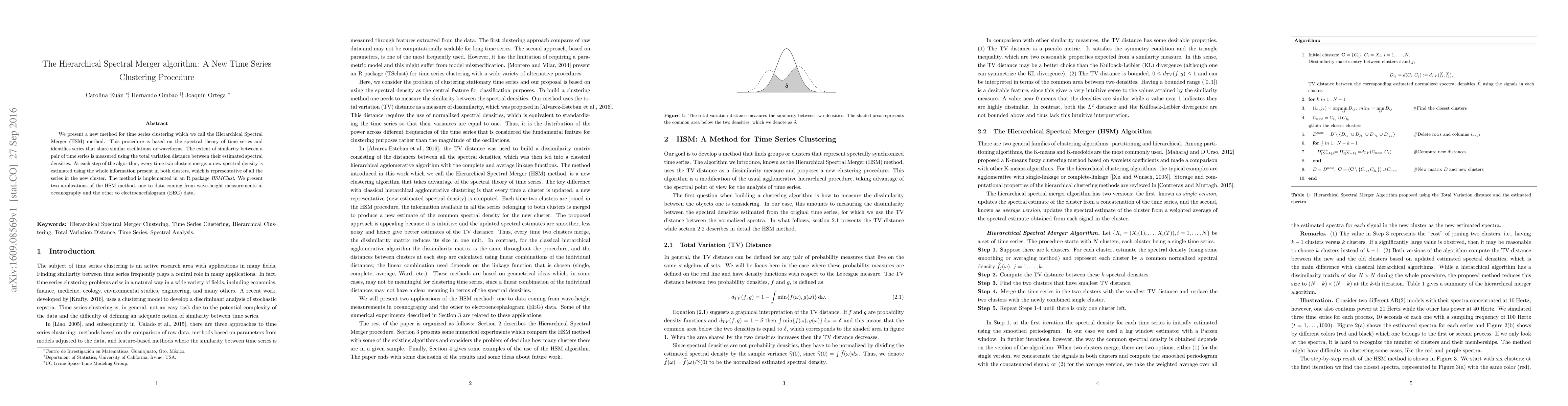 The Hierarchical Spectral Merger (HSM) method is a novel time series clustering technique based on spectral theory, measuring similarity via total variation distance between spectral densities. The R package HSMClust implements this method, which is demonstrated on wave-height and EEG data.