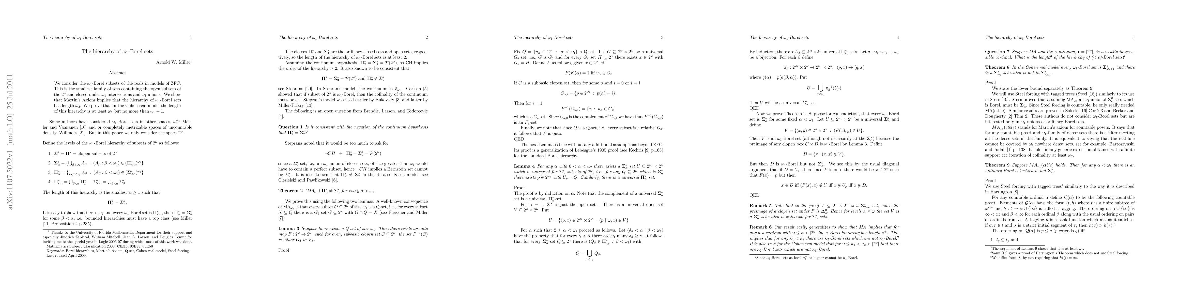 This paper explores the hierarchy of omega1-Borel sets, which includes open sets and is closed under complementation and omega1 unions. It demonstrates that under MA+notCH, the hierarchy reaches length omega2, while in the Cohen real model, it can have lengths either omega1+1 or omega1+2.