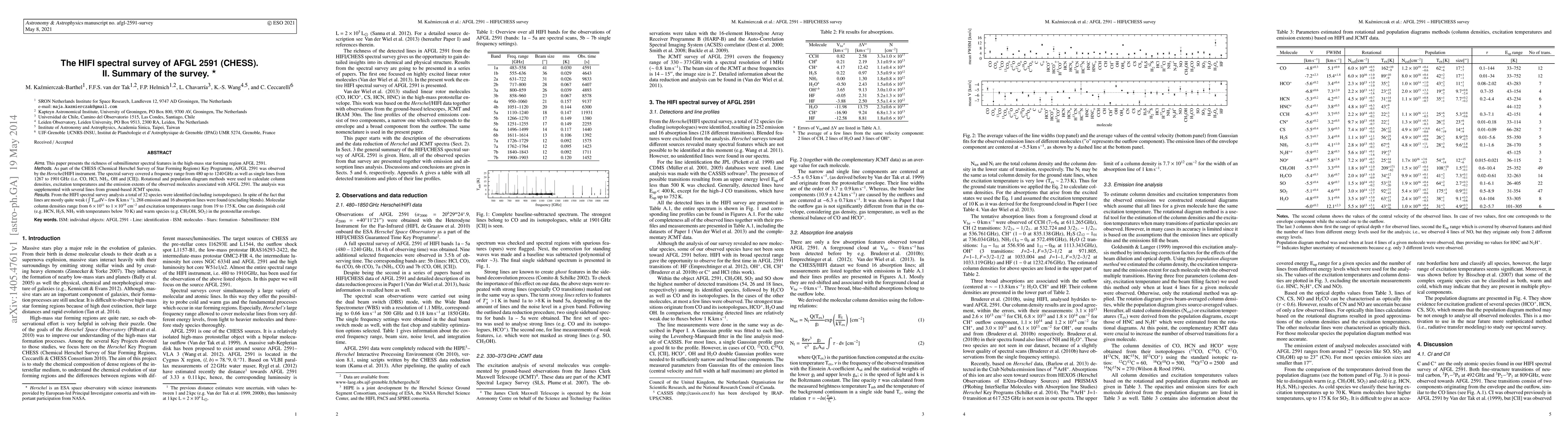 The research utilized the Herschel/HIFI instrument to conduct a spectral survey of the high-mass star forming region AFGL 2591 as part of the CHESS (Chemical Herschel Survey of Star Forming Regions) Key Programme. The survey covered a frequency range from 480 to 1901 GHz, analyzing lines from various molecules including CO, HCl, NH3, OH, and [CII].