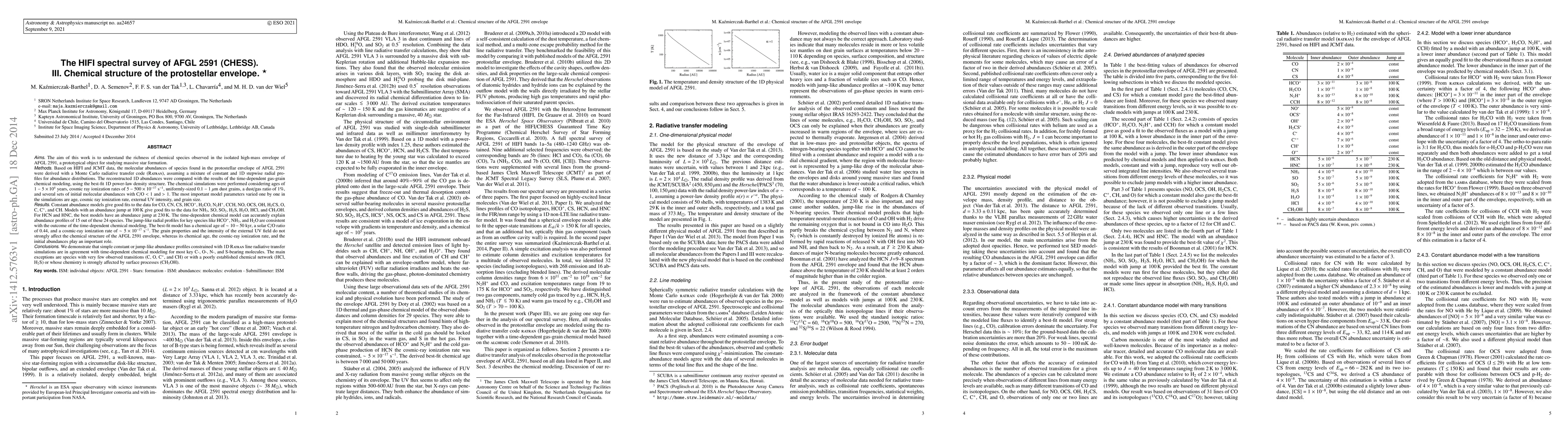This study uses HIFI and JCMT data to derive molecular abundances in the protostellar envelope of AFGL 2591, finding that simple constant or jump-like radial profiles match time-dependent chemical modeling for most key molecules. The best-fit model suggests a chemical age of 10-50 kyr and a solar C/O ratio of 0.44.
