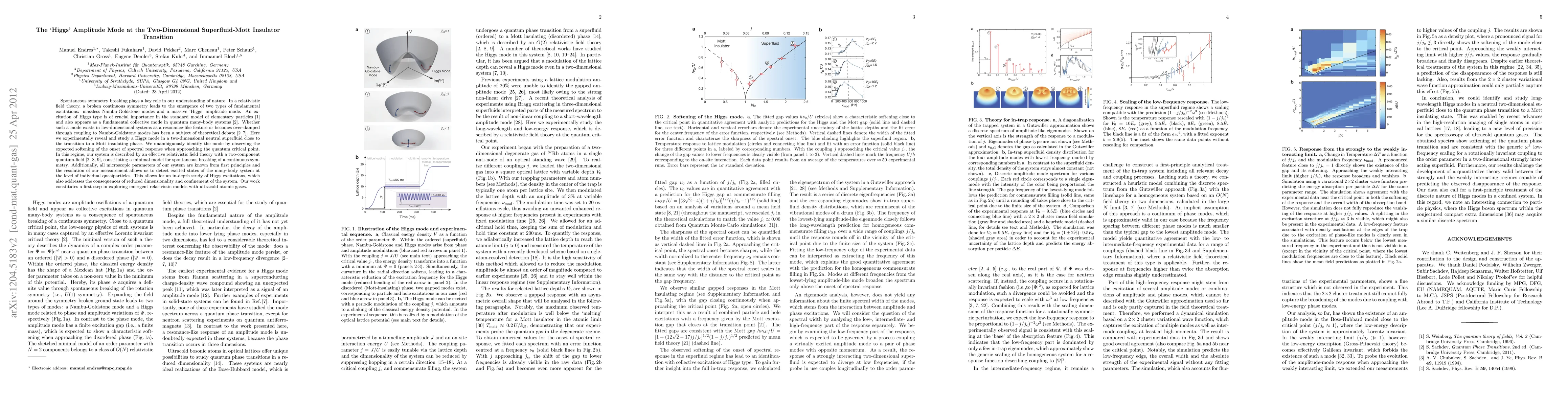 This paper reveals and studies a Higgs amplitude mode in a two-dimensional neutral superfluid near the transition to a Mott insulator, identifying it through the softening of spectral response at the quantum critical point. The study provides a detailed examination of Higgs excitations in low-dimensional systems, contributing to the understanding of emergent relativistic models using ultracold atomic gases.