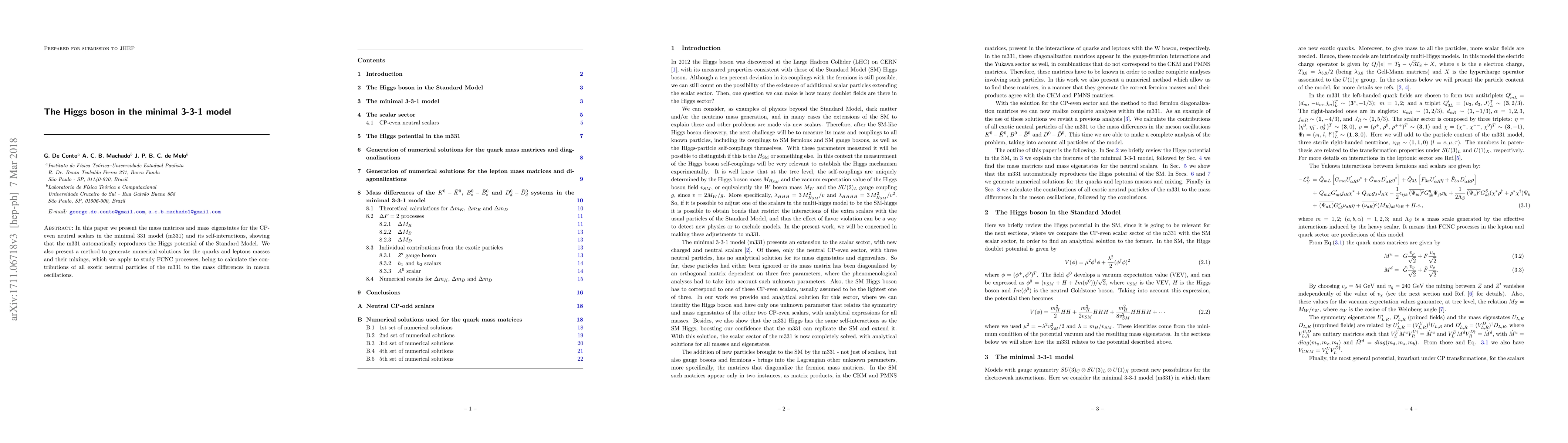 In this paper we present the mass matrices and mass eigenstates for the CP-even neutral scalars in the minimal 331 model (m331) and its self-interactions, showing that the m331 automatically reproduces the Higgs potential of the Standard Model. We also present a method to generate numerical solutions for the quarks and leptons masses and their mixings, which we apply to study FCNC processes, being to calculate the contributions of all exotic neutral particles of the m331 to the mass differences in meson oscillations.