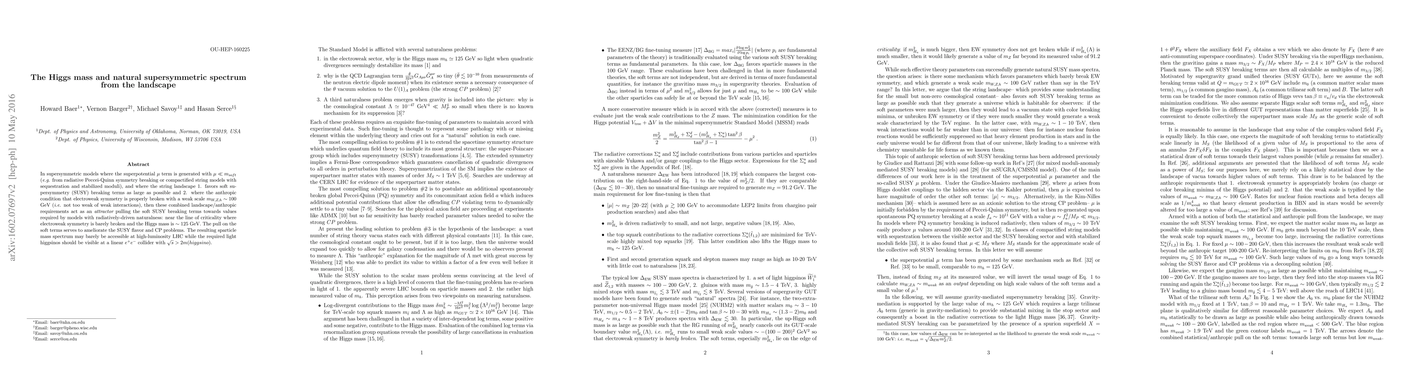 This paper explores how the string landscape and anthropic conditions favor large soft supersymmetry breaking terms, leading to a natural supersymmetric spectrum where the Higgs mass is around 125 GeV, and the sparticle masses are just accessible at high-luminosity LHC, while light higgsinos could be detected at a linear collider.
