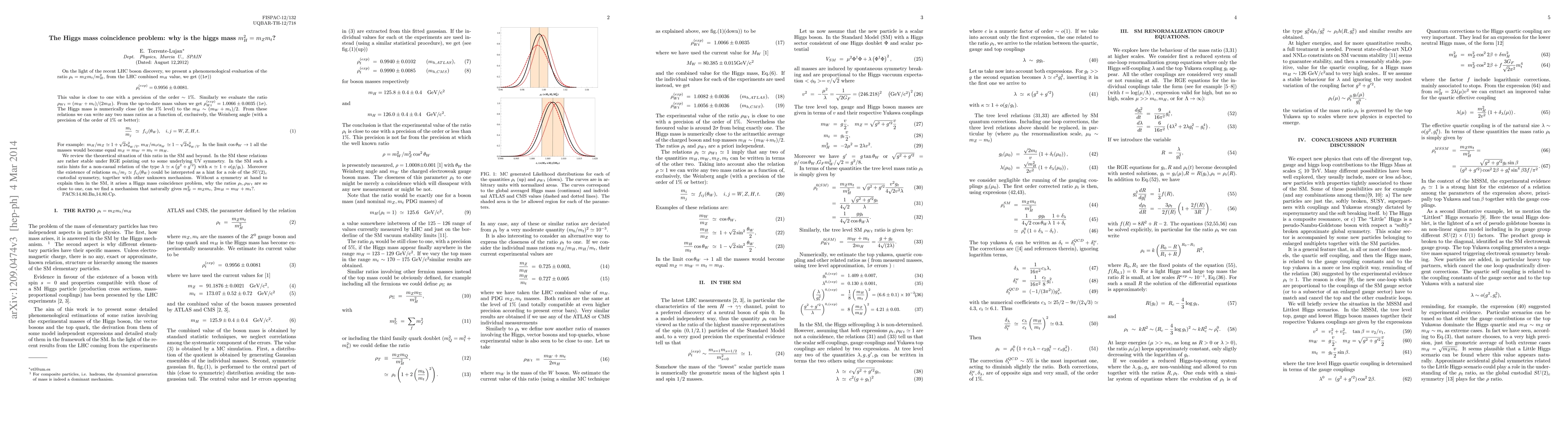 On the light of the recent LHC boson discovery, we present a phenomenological evaluation of the ratio $\rho_t=m_Z m_t/m_H^2$, from the LHC combined $m_H$ value, we get ($ (1\sigma)$) $$\rho_t^{(exp)}= 0.9956\pm 0.0081.$$ This value is close to one with a precision of the order $\sim 1\%$. Similarly we evaluate the ratio $\rho_{Wt}=(m_W + m_t)/(2 m_H)$. From the up-to-date mass values we get $\rho_{Wt}^{(exp)}= 1.0066\pm 0.0035\; (1\sigma).$ The Higgs mass is numerically close (at the $1\%$ level) to the $m_H\sim (m_W+m_t)/2$. From these relations we can write any two mass ratios as a function of, exclusively, the Weinberg angle (with a precision of the order of $1\%$ or better): \begin{eqnarray} \frac{m_i}{m_j}&\simeq & f_{ij}(\theta_W),\quad i,j=W,Z,H,t. \end{eqnarray} For example:$m_H/m_Z \simeq 1+\sqrt{2} s_{\theta_W/2}^2$, $m_H/m_t c_{\theta_W} \simeq 1-\sqrt{2}s_{ \theta_W/2}^2$. In the limit $\cos\theta_W\to 1$ all the masses would become equal $m_Z=m_W=m_t=m_H$. We review the theoretical situation of this ratio in the SM and beyond. In the SM these relations are rather stable under RGE pointing out to some underlying UV symmetry. In the SM such a ratio hints for a non-casual relation of the type $\lambda \simeq \kappa \left (g^2+{g'}{}^2\right )$ with $\kappa\simeq 1+o(g/g_t)$. Moreover the existence of relations $m_i/m_j \simeq f_{ij}(\theta_W)$ could be interpreted as a hint for a role of the $SU(2)_c$ custodial symmetry, together with other unknown mechanism. % Without a symmetry at hand to explain then in the SM, it arises a Higgs mass coincidence problem, why the ratios $\rho_t,\rho_{Wt}$ are so close to one, can we find a mechanism that naturally gives $m_H^2=m_Z m_t$, $2m_H= m_W+m_t$?.