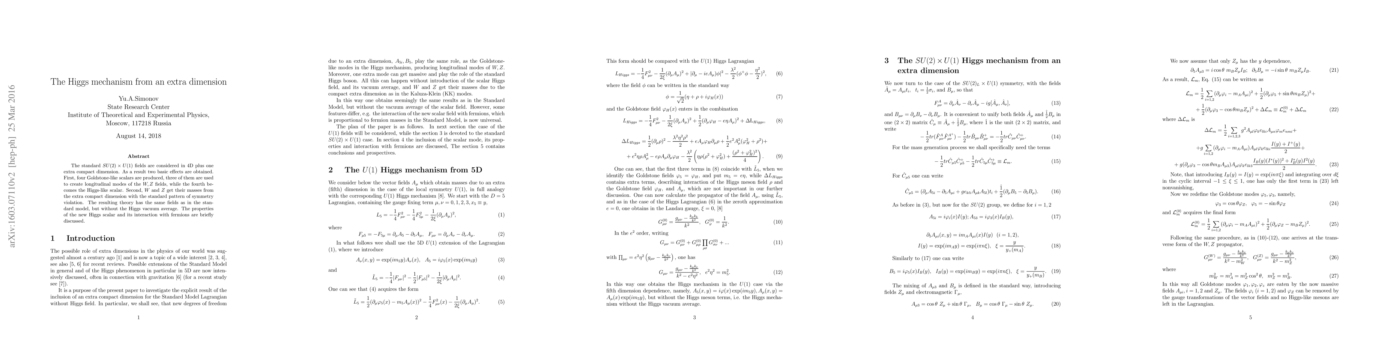 This paper proposes a new theory where the Higgs mechanism is explained by an extra compact dimension in four-dimensional space, producing a Higgs-like scalar without the need for a vacuum average.