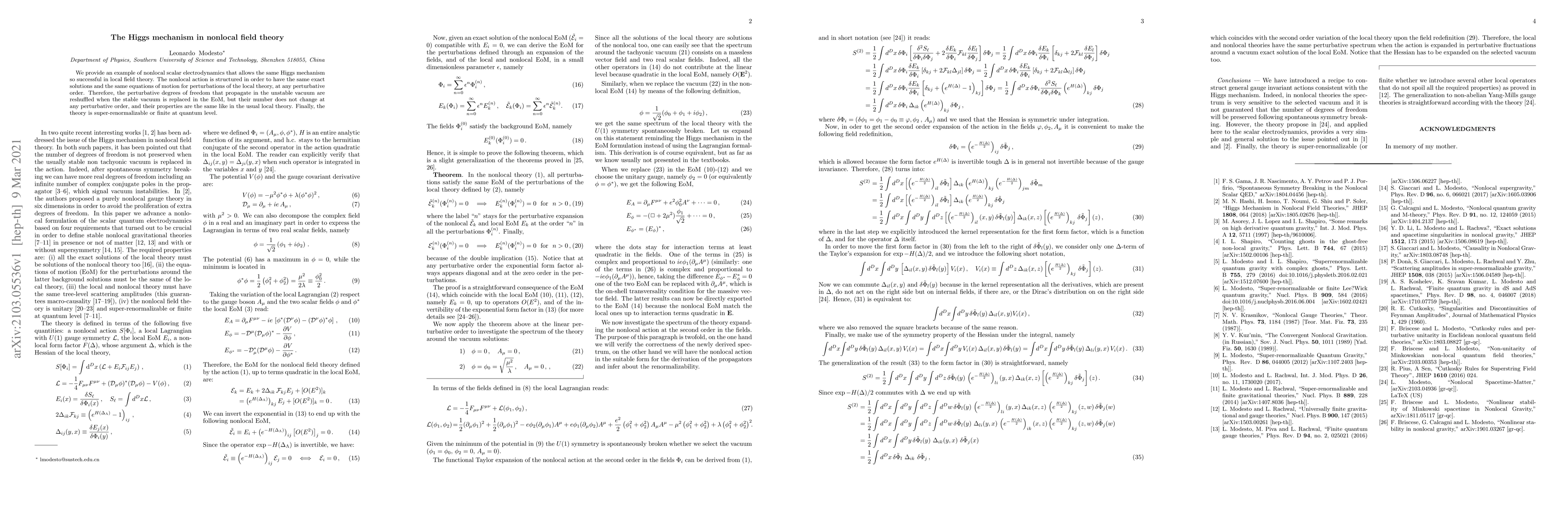 We provide an example of nonlocal scalar electrodynamics that allows the same Higgs mechanism so successful in local field theory. The nonlocal action is structured in order to have the same exact solutions and the same equations of motion for perturbations of the local theory, at any perturbative order. Therefore, the perturbative degrees of freedom that propagate in the unstable vacuum are reshuffled when the stable vacuum is replaced in the EoM, but their number does not change at any perturbative order, and their properties are the same like in the usual local theory. Finally, the theory is super-renormalizable or finite at quantum level.
