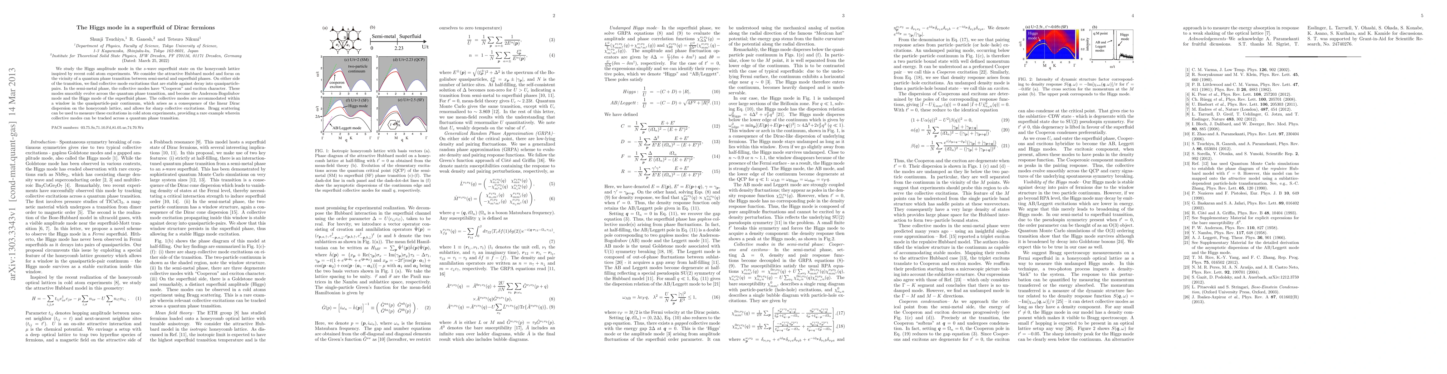 We study the Higgs amplitude mode in the s-wave superfluid state on the honeycomb lattice inspired by recent cold atom experiments. We consider the attractive Hubbard model and focus on the vicinity of a quantum phase transition between semi-metal and superfluid phases. On either side of the transition, we find collective mode excitations that are stable against decay into quasiparticle-pairs. In the semi-metal phase, the collective modes have "Cooperon" and exciton character. These modes smoothly evolve across the quantum phase transition, and become the Anderson-Bogoliubov mode and the Higgs mode of the superfluid phase. The collective modes are accommodated within a window in the quasiparticle-pair continuum, which arises as a consequence of the linear Dirac dispersion on the honeycomb lattice, and allows for sharp collective excitations. Bragg scattering can be used to measure these excitations in cold atom experiments, providing a rare example wherein collective modes can be tracked across a quantum phase transition.