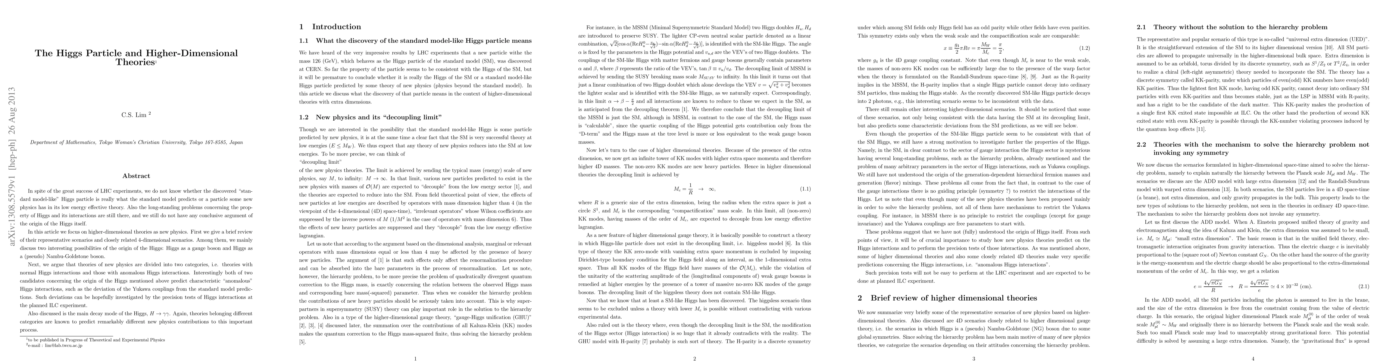 In spite of the great success of LHC experiments, we do not know whether the discovered "standard model-like" Higgs particle is really what the standard model predicts or a particle some new physics has in its low energy effective theory. Also the long-standing problems concerning the property of Higgs and its interactions are still there, and we still do not have any conclusive argument of the origin of the Higgs itself. In this article we focus on higher-dimensional theories as new physics. First we give a brief review of their representative scenarios and closely related 4-dimensional scenarios. Among them, we mainly discuss two interesting possibilities of the origin of the Higgs: Higgs as a gauge boson and Higgs as a (pseudo) Nambu-Goldstone boson. Next, we argue that theories of new physics are divided into two categories, i.e. theories with normal Higgs interactions and those with anomalous Higgs interactions. Interestingly both of two candidates concerning the origin of the Higgs mentioned above predict characteristic "anomalous" Higgs interactions, such as the deviation of the Yukawa couplings from the standard model predictions. Such deviations can be hopefully investigated by the precision tests of Higgs interactions at the planned ILC experiment. Also discussed is the main decay mode of the Higgs, $H \to \gamma \gamma$. Again, theories belonging different categories are known to predict remarkably different new physics contributions to this important process.