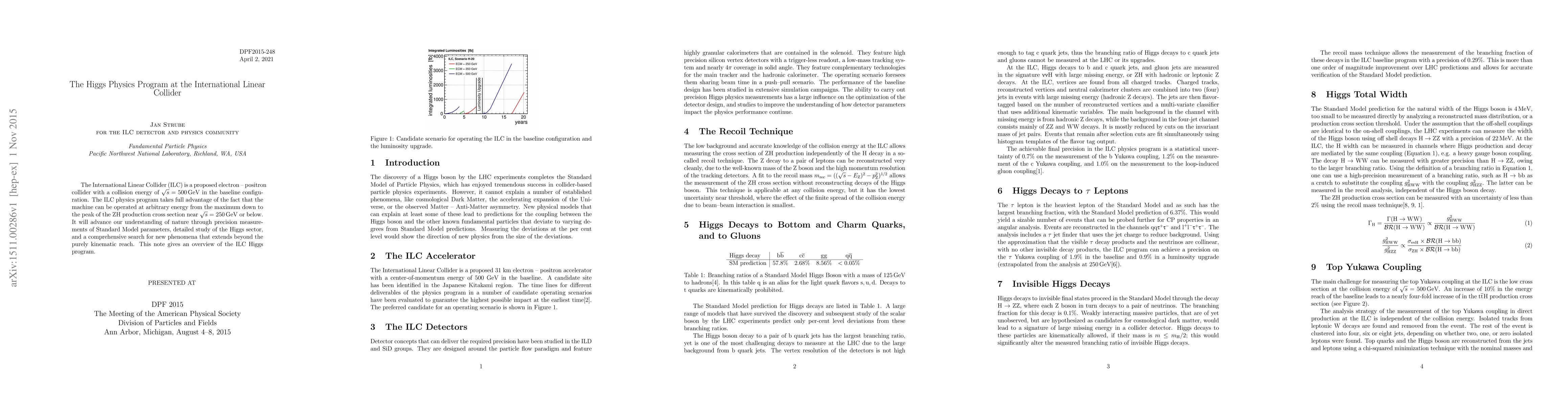 The International Linear Collider (ILC) is a proposed electron -- positron collider with a collision energy of $\sqrt{s}$ = 500 GeV in the baseline configuration. The ILC physics program takes full advantage of the fact that the machine can be operated at arbitrary energy from the maximum down to the peak of the ZH production cross section near $\sqrt{s}$ = 250 GeV or below. It will advance our understanding of nature through precision measurements of Standard Model parameters, detailed study of the Higgs sector, and a comprehensive search for new phenomena that extends beyond the purely kinematic reach. This note gives an overview of the ILC Higgs program.