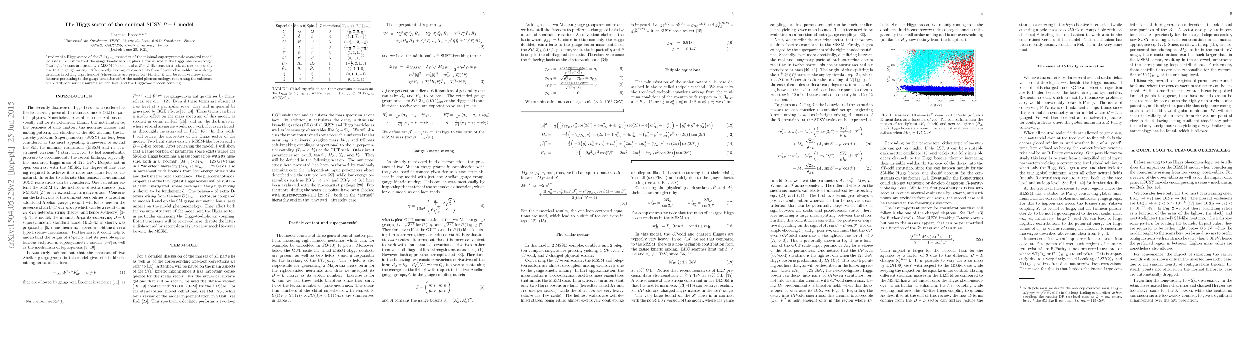 I review the Higgs sector of the $U(1)_{B-L}$ extension of the minimal supersymmetric standard model (MSSM). I will show that the gauge kinetic mixing plays a crucial role in the Higgs phenomenology. Two light bosons are present, a MSSM-like one and a $B-L$-like one, that mix at one loop solely due to the gauge mixing. After briefly looking at constraints from flavour observables, new decay channels involving right-handed (s)neutrinos are presented. Finally, it will be reviewed how model features pertaining to the gauge extension affect the model phenomenology, concerning the existence of R-Parity-conserving minima at loop level and the Higgs-to-diphoton coupling.