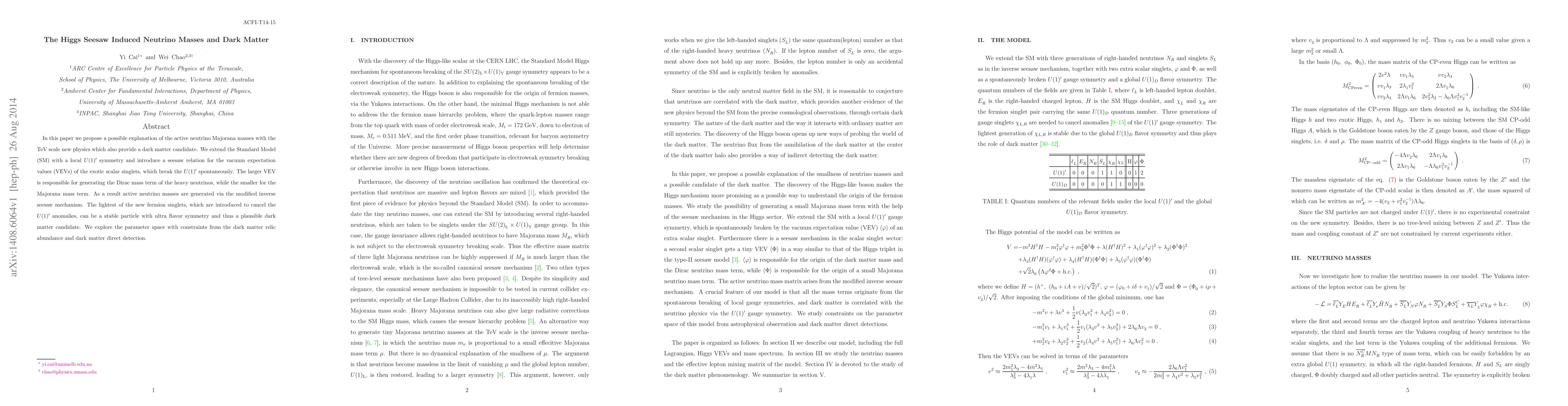 In this paper we propose a possible explanation of the active neutrino Majorana masses with the TeV scale new physics which also provide a dark matter candidate. We extend the Standard Model (SM) with a local U(1)' symmetry and introduce a seesaw relation for the vacuum expectation values (VEVs) of the exotic scalar singlets, which break the U(1)' spontaneously. The larger VEV is responsible for generating the Dirac mass term of the heavy neutrinos, while the smaller for the Majorana mass term. As a result active neutrino masses are generated via the modified inverse seesaw mechanism. The lightest of the new fermion singlets, which are introduced to cancel the U(1)' anomalies, can be a stable particle with ultra flavor symmetry and thus a plausible dark matter candidate. We explore the parameter space with constraints from the dark matter relic abundance and dark matter direct detection.