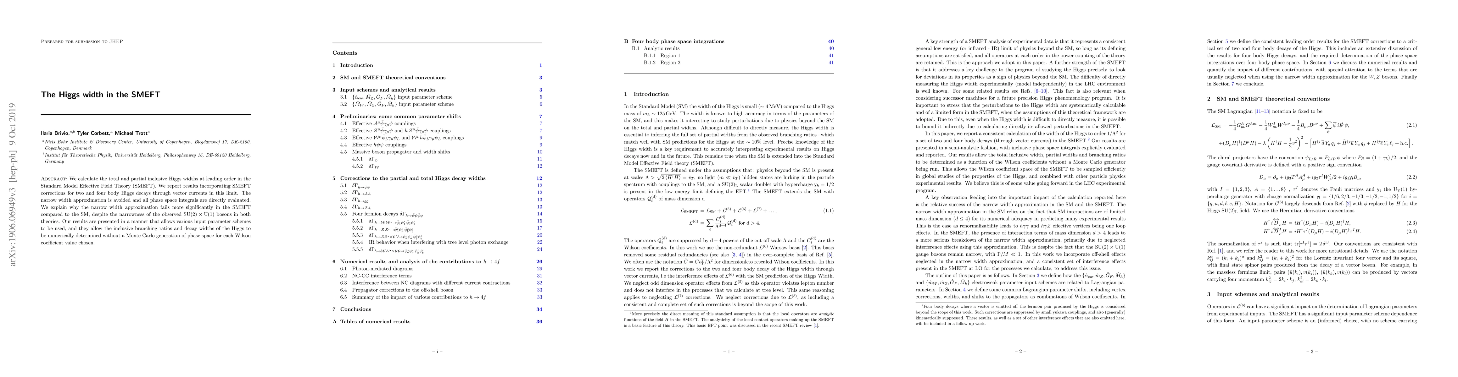 This paper calculates the Higgs width at leading order in the SMEFT, incorporating SMEFT corrections for two and four body decays via vector currents. It avoids the narrow width approximation and directly evaluates phase space integrals, demonstrating why this approximation fails more significantly in SMEFT than in the Standard Model.