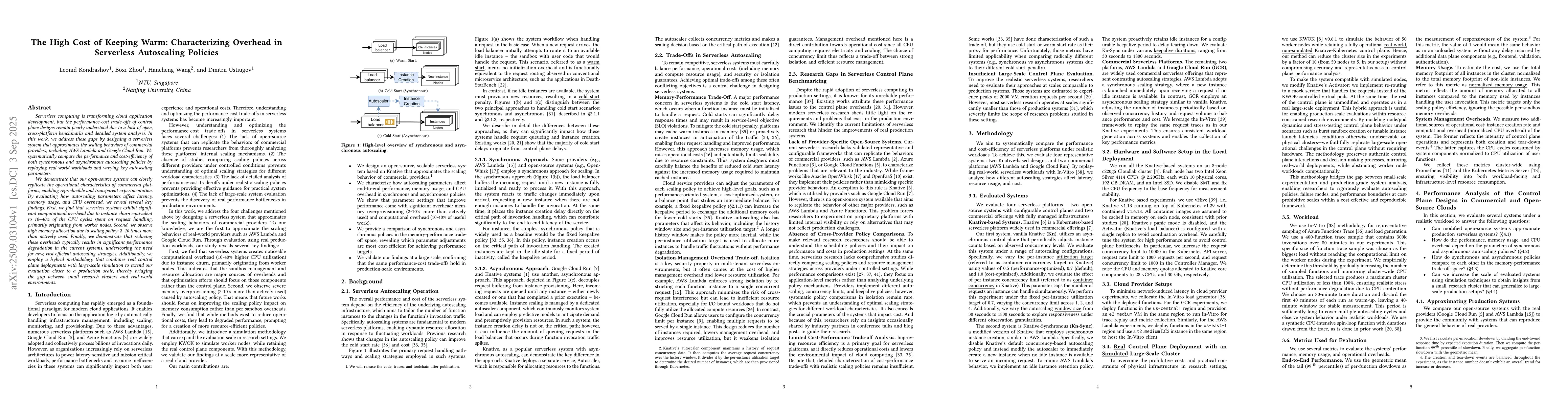 Serverless computing is transforming cloud application development, but the performance-cost trade-offs of control plane designs remain poorly understood due to a lack of open, cross-platform benchmarks and detailed system analyses. In this work, we address these gaps by designing a serverless system that approximates the scaling behaviors of commercial providers, including AWS Lambda and Google Cloud Run. We systematically compare the performance and cost-efficiency of both synchronous and asynchronous autoscaling policies by replaying real-world workloads and varying key autoscaling parameters. We demonstrate that our open-source systems can closely replicate the operational characteristics of commercial platforms, enabling reproducible and transparent experimentation. By evaluating how autoscaling parameters affect latency, memory usage, and CPU overhead, we reveal several key findings. First, we find that serverless systems exhibit significant computational overhead due to instance churn equivalent to 10-40% of the CPU cycles spent on request handling, primarily originating from worker nodes. Second, we observe high memory allocation due to scaling policy: 2-10 times more than actively used. Finally, we demonstrate that reducing these overheads typically results in significant performance degradation in the current systems, underscoring the need for new, cost-efficient autoscaling strategies. Additionally, we employ a hybrid methodology that combines real control plane deployments with large-scale simulation to extend our evaluation closer to a production scale, thereby bridging the gap between small research clusters and real-world environments.