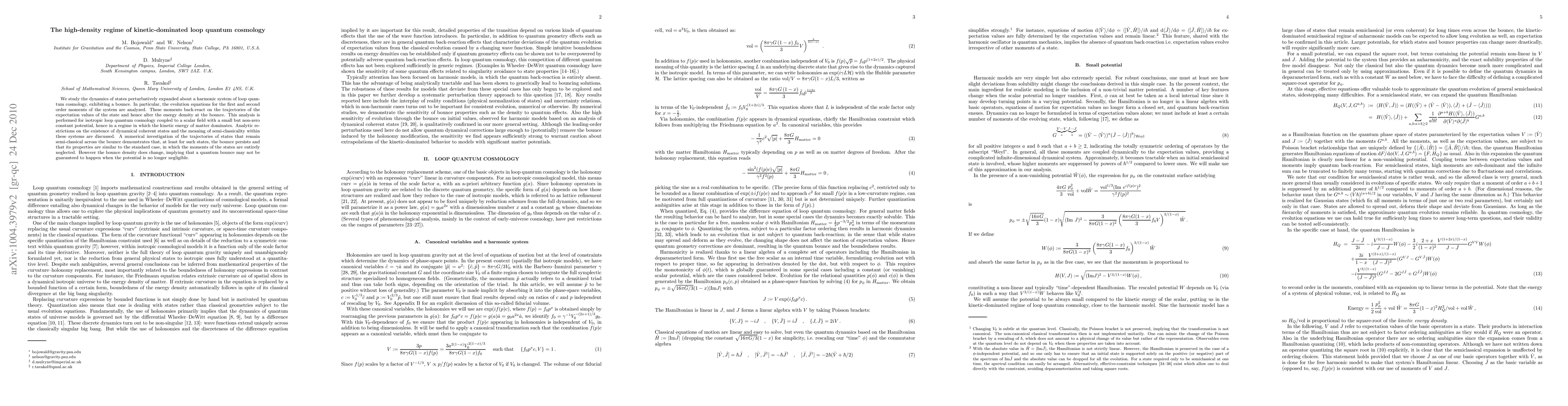 We study the dynamics of states perturbatively expanded about a harmonic system of loop quantum cosmology, exhibiting a bounce. In particular, the evolution equations for the first and second order moments of the system are analyzed. These moments back-react on the trajectories of the expectation values of the state and hence alter the energy density at the bounce. This analysis is performed for isotropic loop quantum cosmology coupled to a scalar field with a small but non-zero constant potential, hence in a regime in which the kinetic energy of matter dominates. Analytic restrictions on the existence of dynamical coherent states and the meaning of semi-classicality within these systems are discussed. A numerical investigation of the trajectories of states that remain semi-classical across the bounce demonstrates that, at least for such states, the bounce persists and that its properties are similar to the standard case, in which the moments of the states are entirely neglected. However the bounce density does change, implying that a quantum bounce may not be guaranteed to happen when the potential is no longer negligible.
