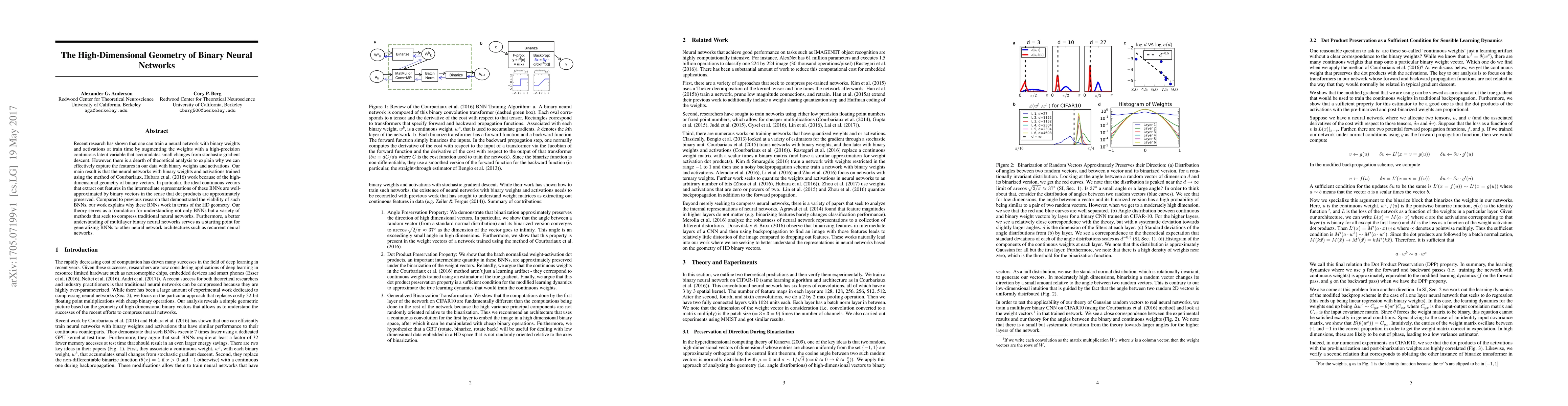 Recent research has shown that one can train a neural network with binary weights and activations at train time by augmenting the weights with a high-precision continuous latent variable that accumulates small changes from stochastic gradient descent. However, there is a dearth of theoretical analysis to explain why we can effectively capture the features in our data with binary weights and activations. Our main result is that the neural networks with binary weights and activations trained using the method of Courbariaux, Hubara et al. (2016) work because of the high-dimensional geometry of binary vectors. In particular, the ideal continuous vectors that extract out features in the intermediate representations of these BNNs are well-approximated by binary vectors in the sense that dot products are approximately preserved. Compared to previous research that demonstrated the viability of such BNNs, our work explains why these BNNs work in terms of the HD geometry. Our theory serves as a foundation for understanding not only BNNs but a variety of methods that seek to compress traditional neural networks. Furthermore, a better understanding of multilayer binary neural networks serves as a starting point for generalizing BNNs to other neural network architectures such as recurrent neural networks.