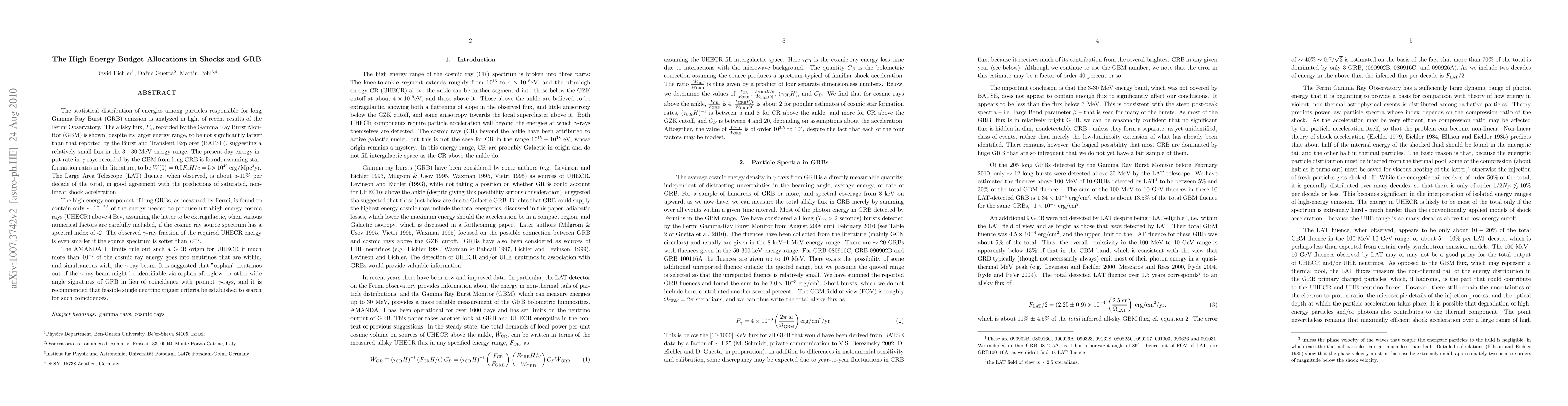 The statistical distribution of energies among particles responsible for long Gamma Ray Burst (GRB) emission is analyzed in light of recent results of the Fermi Observatory. The allsky flux, $F_{\gamma}$, recorded by the Gamma Ray Burst Monitor (GBM) is shown, despite its larger energy range, to be not significantly larger than that reported by the Burst and Transient Explorer (BATSE), suggesting a relatively small flux in the 3 - 30 MeV energy range. The present-day energy input rate in $\gamma$-rays recorded by the GBM from long GRB is found, assuming star-formation rates in the literature, to be $\dot W(0)=0.5 F_{\gamma} H/c = 5 \times 10^{42}\ \rm{erg/Mpc^3 yr}$. The Large Area Telescope (LAT) fluence, when observed, is about 5-10\% per decade of the total, in good agreement with the predictions of saturated, non-linear shock acceleration. The high-energy component of long GRBs, as measured by Fermi, is found to contain only $\sim 10^{-2.5}$ of the energy needed to produce ultrahigh-energy cosmic rays (UHECR) above 4 Eev, assuming the latter to be extragalactic, when various numerical factors are carefully included, if the cosmic ray source spectrum has a spectral index of -2. The observed $\gamma$-ray fraction of the required UHECR energy is even smaller if the source spectrum is softer than $E^{-2}$. The AMANDA II limits rule out such a GRB origin for UHECR if much more than $10^{-2}$ of the cosmic ray energy goes into neutrinos that are within, and simultaneous with, the $\gamma$-ray beam. It is suggested that "orphan" neutrinos out of the $\gamma$-ray beam might be identifiable via orphan afterglow { or other wide angle signatures of GRB in lieu of coincidence with prompt $\gamma$-rays}, and it is recommended that feasible single neutrino trigger criteria be established to search for such coincidences.